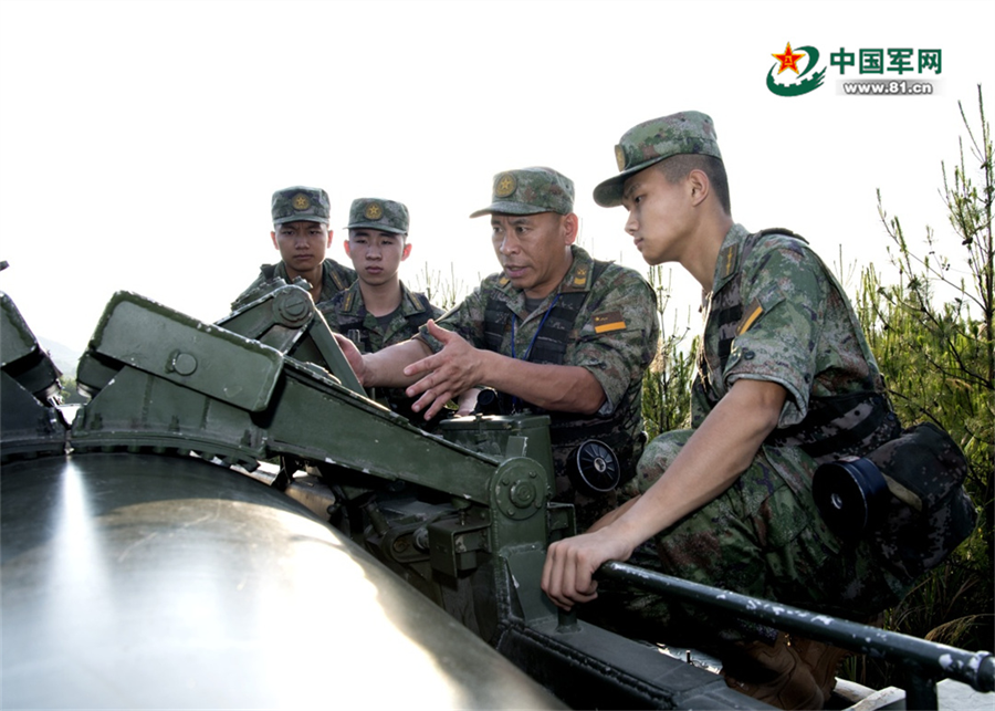 何贤达(右二)帮助新排长掌握专业技能。刘明松 摄