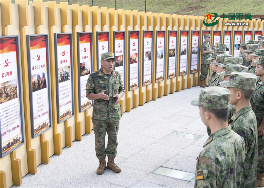 2022年6月,火箭军某部举行优秀“四会”政治教员评选,何贤达成为唯一入选“优秀政治教员标兵”的军士。图为何贤达在军史长廊为战友们讲解光荣传统。刘明松 摄