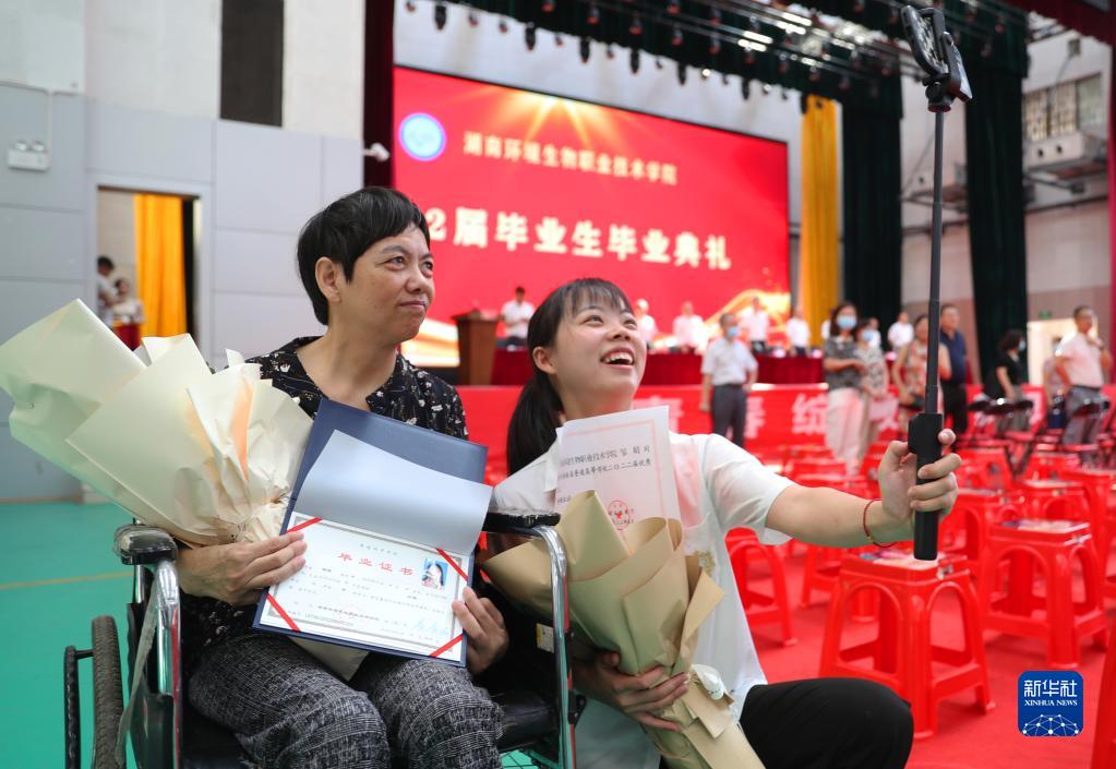 这是6月27日,在湖南省衡阳市湖南省环境生物职业技术学院毕业典礼会场,带着妈妈上大学的邹晴在领到毕业证和湖南省优秀毕业生证书后与妈妈自拍合影留念。