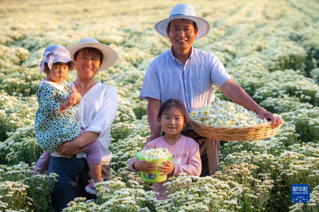 这是9月21日,在山东省淄博市高青县黑里寨镇黑二村,种植中药材的“70后”家庭农场主张新广(右一)和家人在菊花田间合影留念。