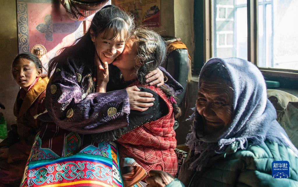 这是1月18日,在西藏当雄县纳措乡甲嘎村,放寒假回家的江苏食品药品职业技术学院中药学专业大学生旦增卓玛(左二)和母亲边卓说悄悄话。