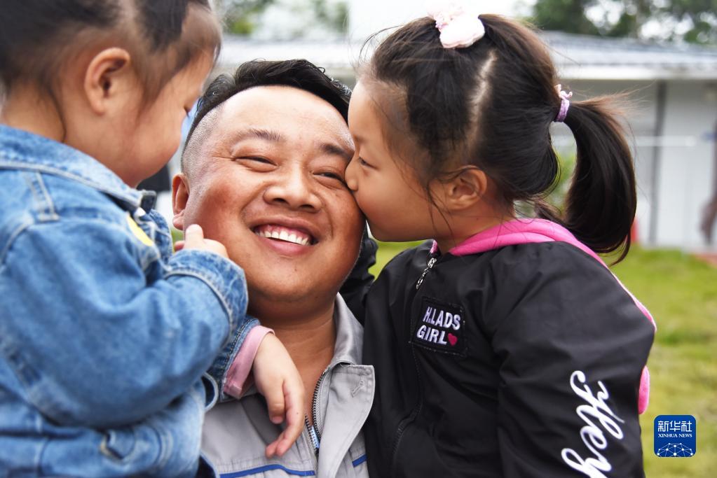 这是1月24日,在广东省汕尾市海丰县,沈海高速深圳到汕尾段改扩建项目工作人员杨兴义在板房宿舍前与春节前夕来团聚的孩子们拥抱亲吻。