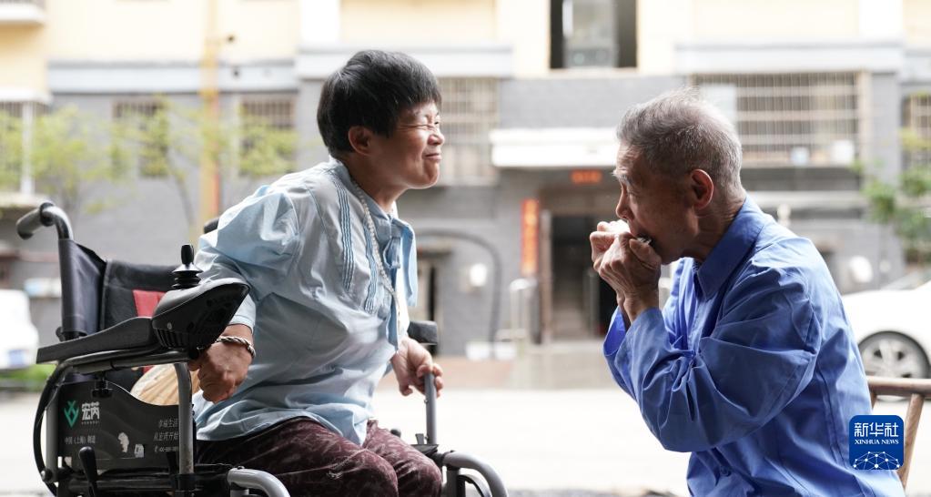 这是6月18日,在江西省新余市宝泰小区,72岁的廖斌晟为从小患有先天性脑瘫、智力水平只相当于7岁儿童的女儿廖永红吹奏口琴。