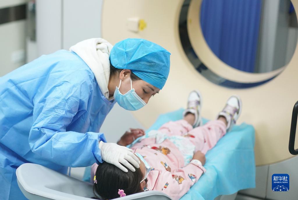 这是5月12日,在位于江苏省南京市的南京医科大学第二附属医院,护士安慰准备接受CT增强检查的西藏先天性心脏病小患者达瓦卓玛。