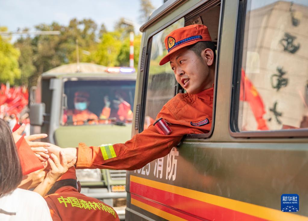 这是8月28日,在重庆市北碚区,参与山火扑救的云南森林消防队员在完成任务撤离时与群众握手道别。