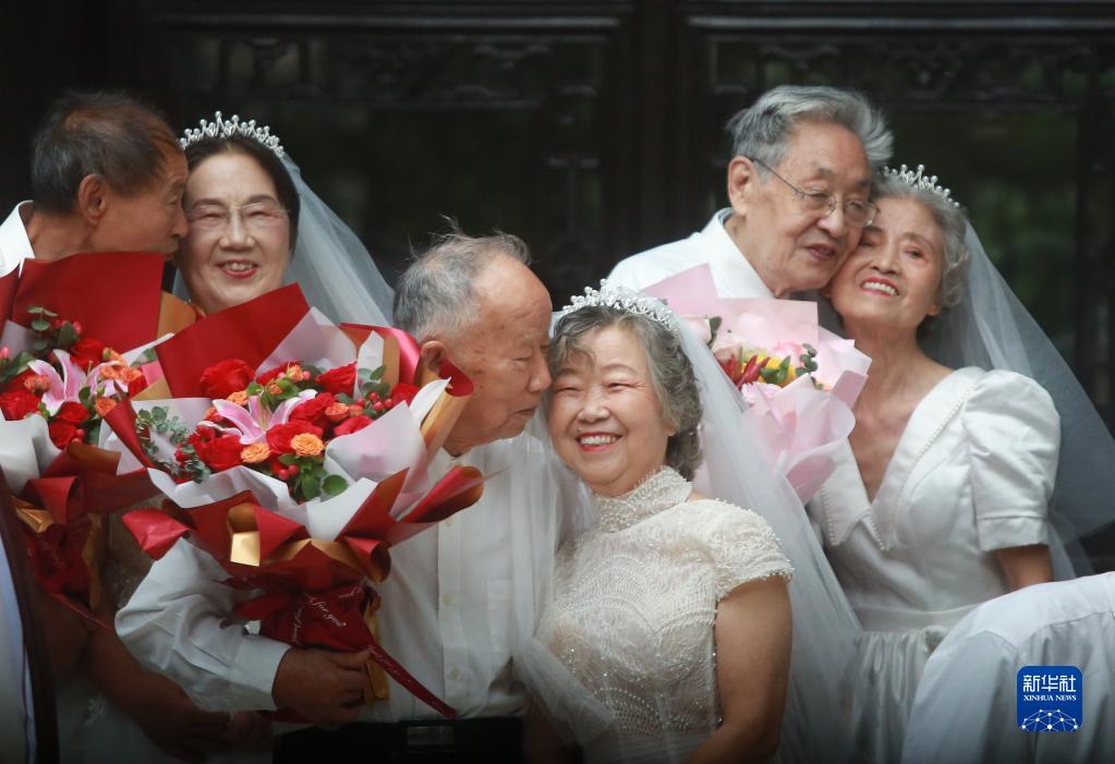 这是10月4日,金婚老人在江苏省扬州市何园景区参加金婚庆典活动。