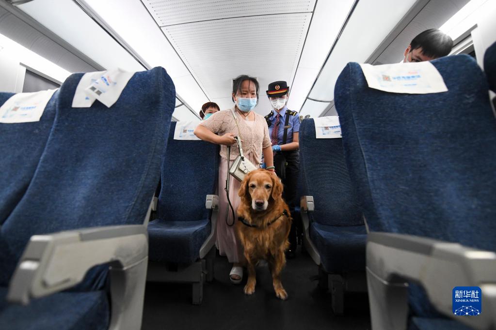 这是8月19日,在河源东到深圳北的G2267次车上,视障人士张莉和导盲犬满悦在列车长李双(左三)帮助下准备下车。