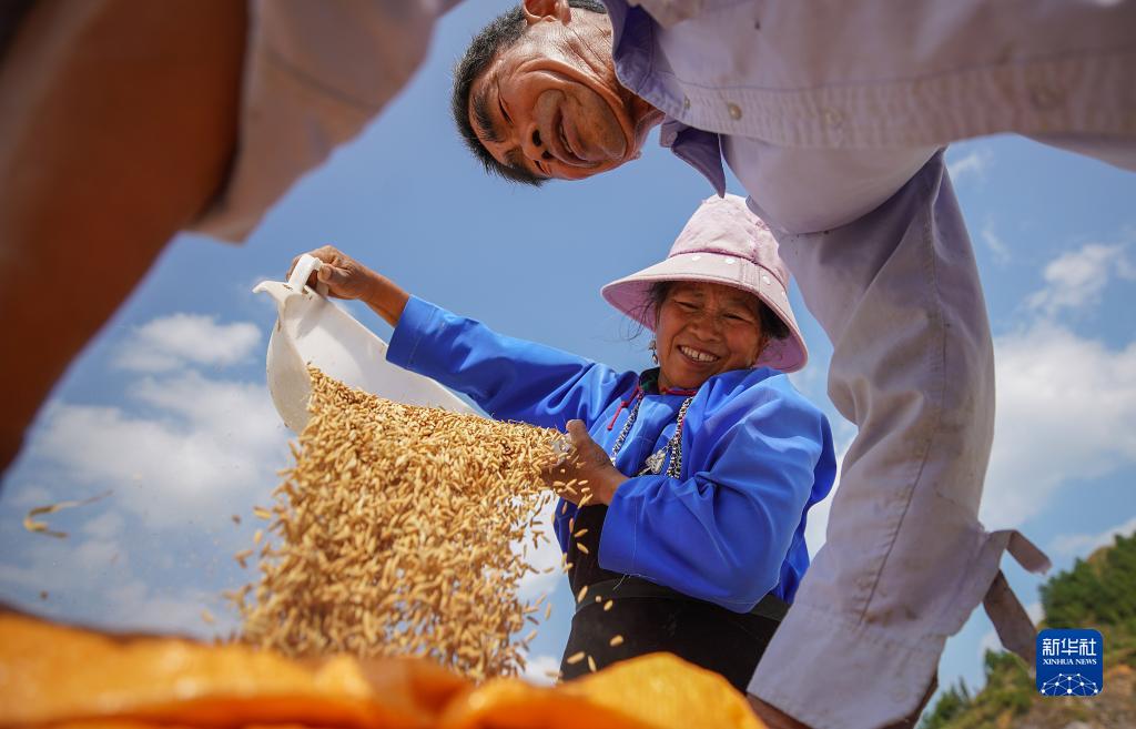 这是9月17日,在贵州省黔东南苗族侗族自治州丹寨县金泉街道,村民将晾晒好的稻谷装袋。