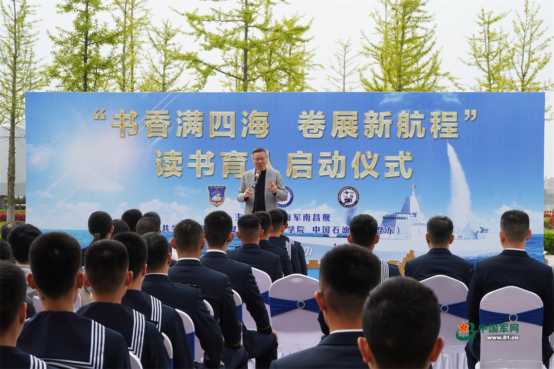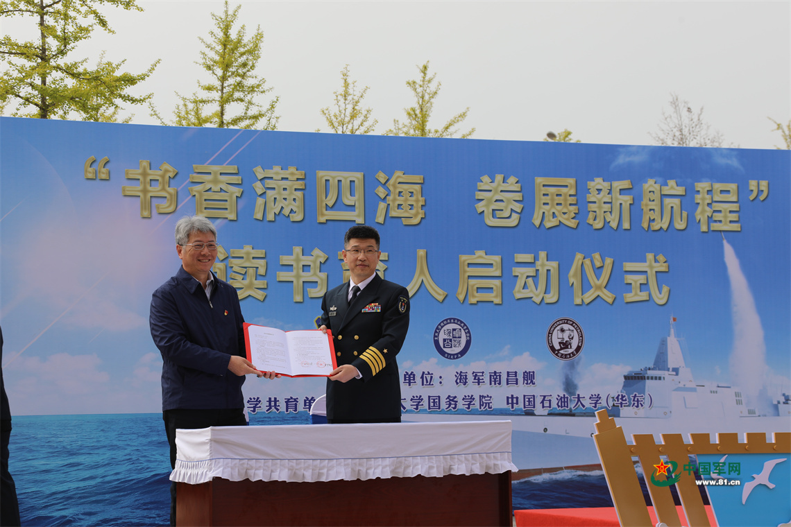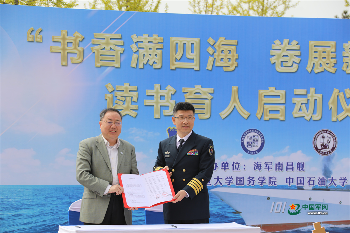4月20日上午,在世界读书日和人民海军成立纪念日来临之际,海军南昌舰邀请复旦大学、中国石油大学师生代表,在某驱逐舰支队先锋广场共同举办“书香满四海,卷展新航程”读书育人活动,并分别与两所大学签订共学共教协议。