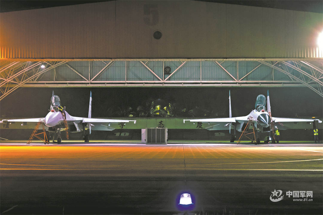 该图片记录下机库中地面保障人员检查维护飞机的画面,现场紧张有序,战机蓄势待发,充分展现出机务官兵严谨细致的工作作风。两架战机整齐列阵,画面对称性强,展现了海军航空兵部队威武雄壮的姿态和“叱咤海天、敢打敢拼”的气魄。