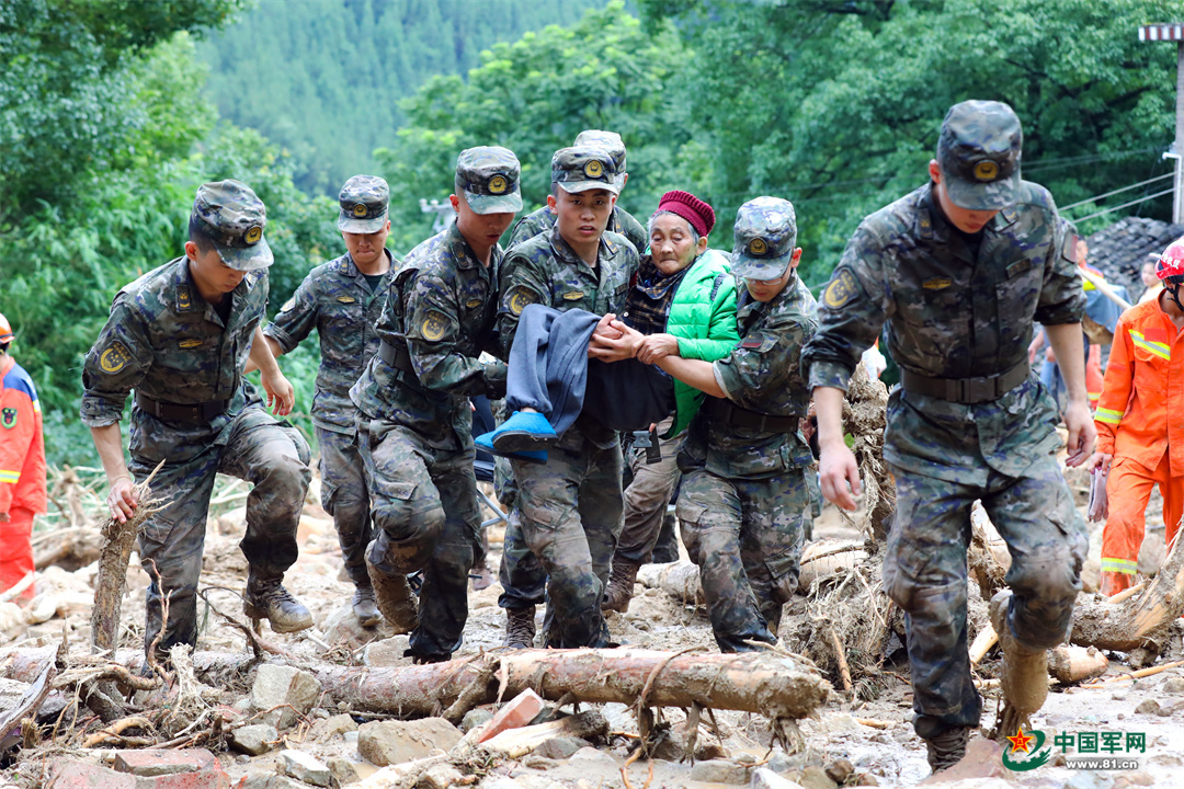 7月5日,新华社发布了重庆万州区长滩镇出现特大暴雨,武警重庆总队执勤第三支队官兵转移被困群众图片。图为官兵转移腿脚不便的老人。李东 摄(点击查看详细报道)