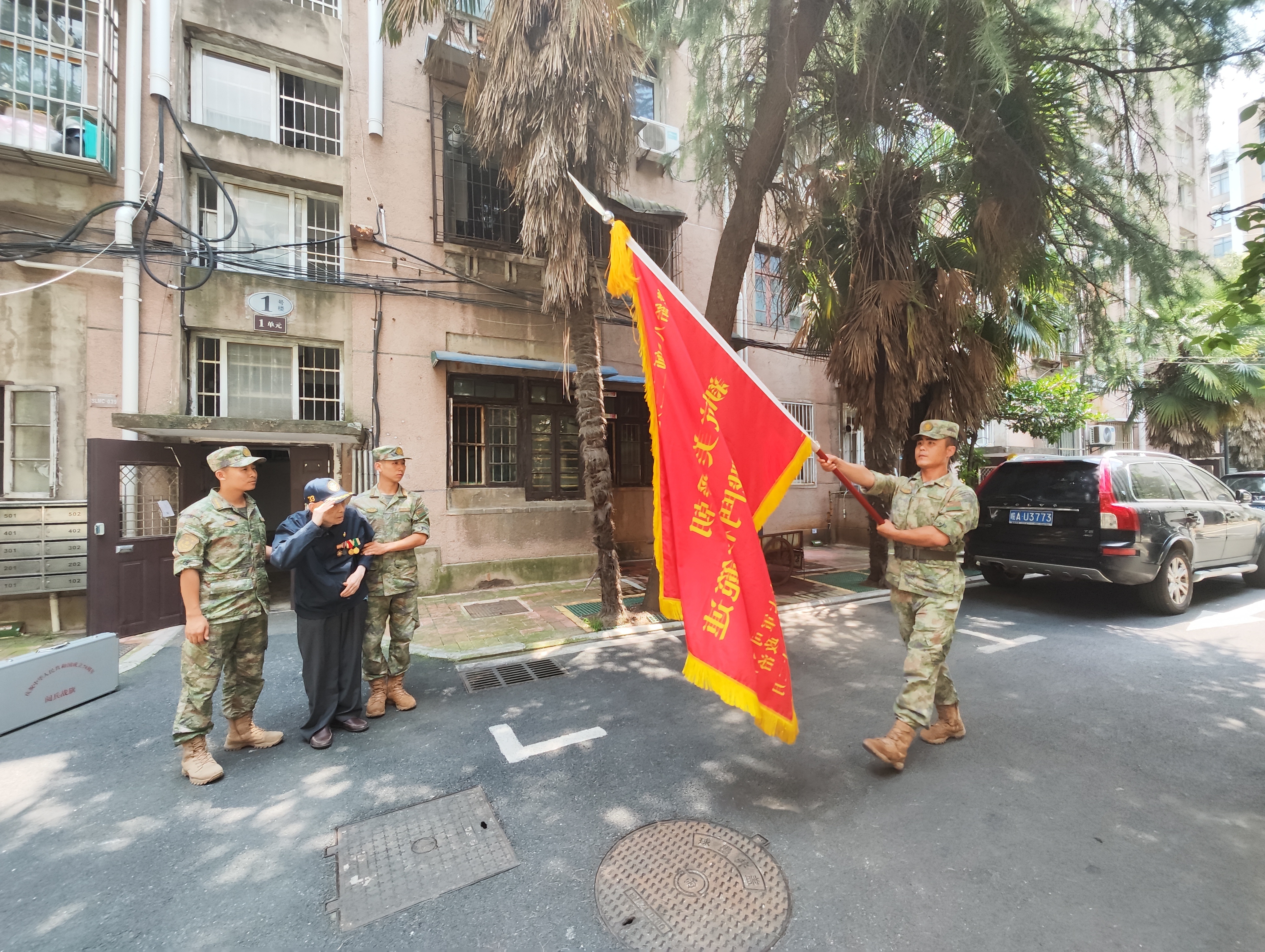 张崇岫向“新兴里战斗模范连”战旗敬礼。许国 摄