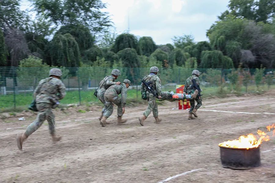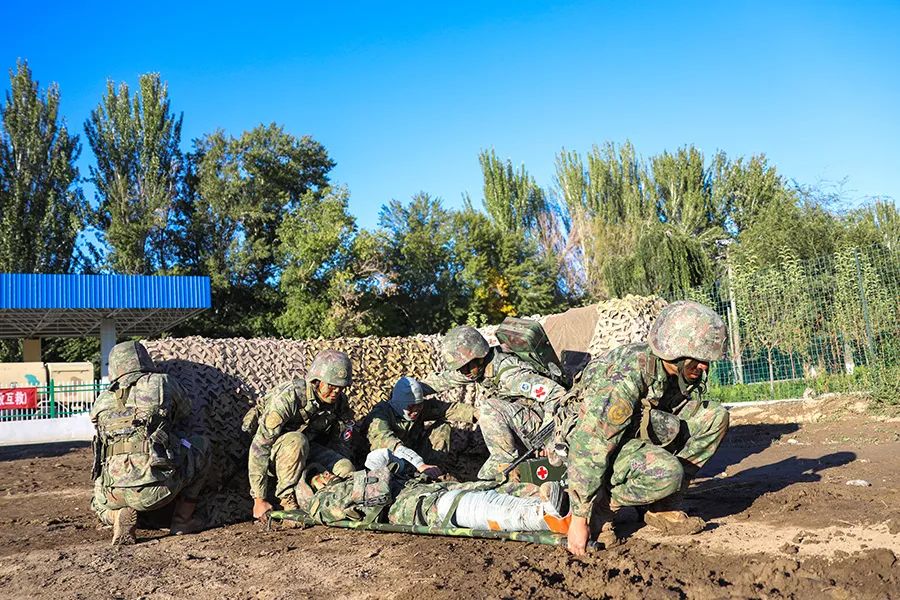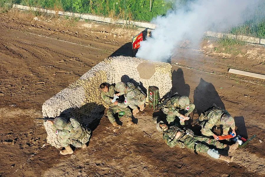 战伤自救互救专修训练采用“赛道式”实战化训练场地,对“搜、抢、转、救、运”等战时救护必备技能进行考核。