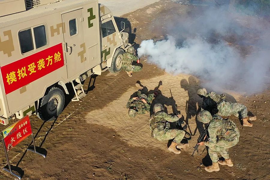 “我方雷达阵地遭敌远程攻击,两名操纵员受伤,请立即救援。”指令一下,战伤自救互救小组立即利用掩体,交互掩护完成30米“S”形跃进,采取低姿战术接近方舱,对受伤人员进行救治。