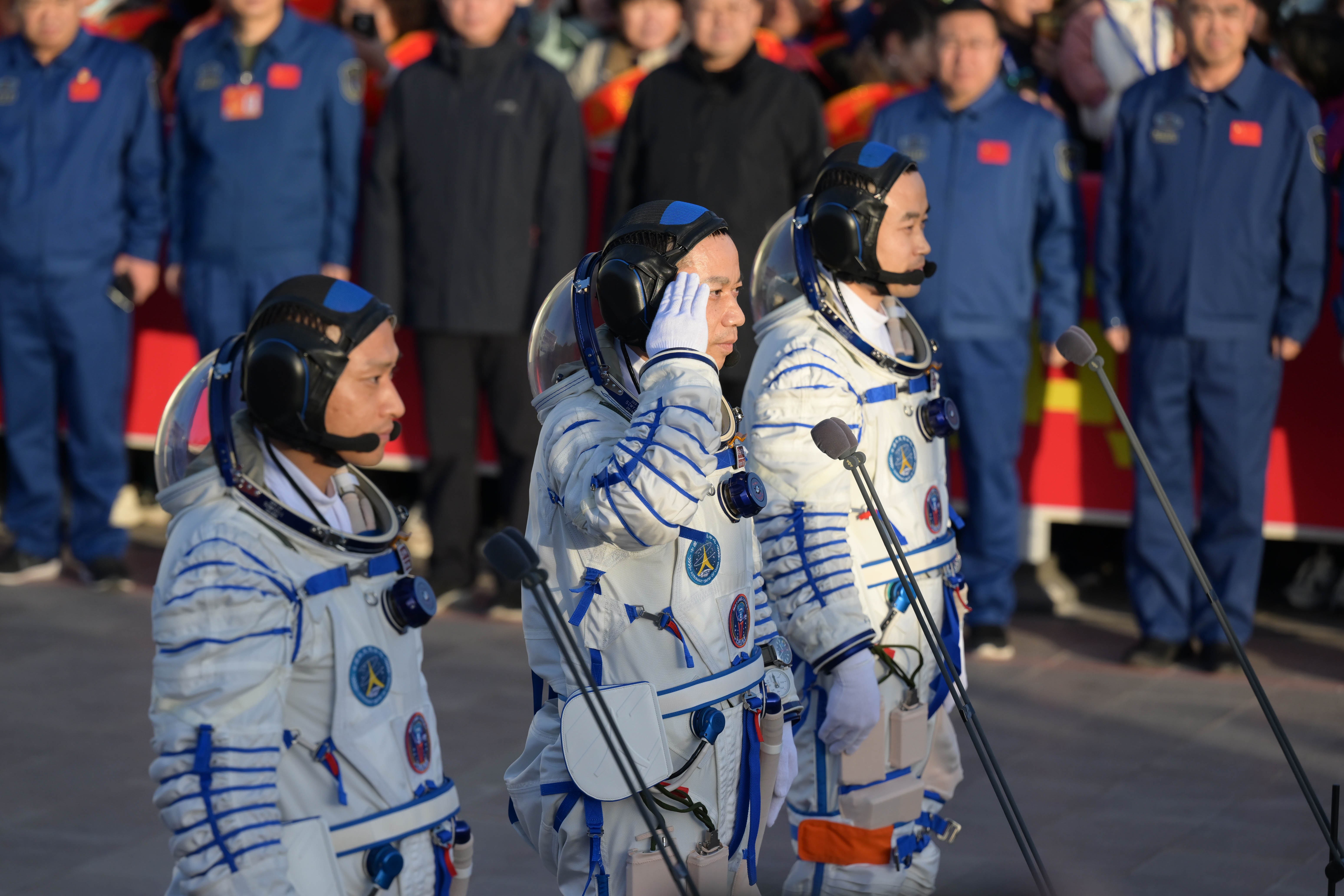 10月26日上午,神舟十七号载人飞行任务航天员乘组出征仪式在酒泉卫星发射中心问天阁圆梦园广场举行。这是航天员汤洪波(左)、唐胜杰(中)、江新林在出征仪式上。新华社记者 李刚 摄