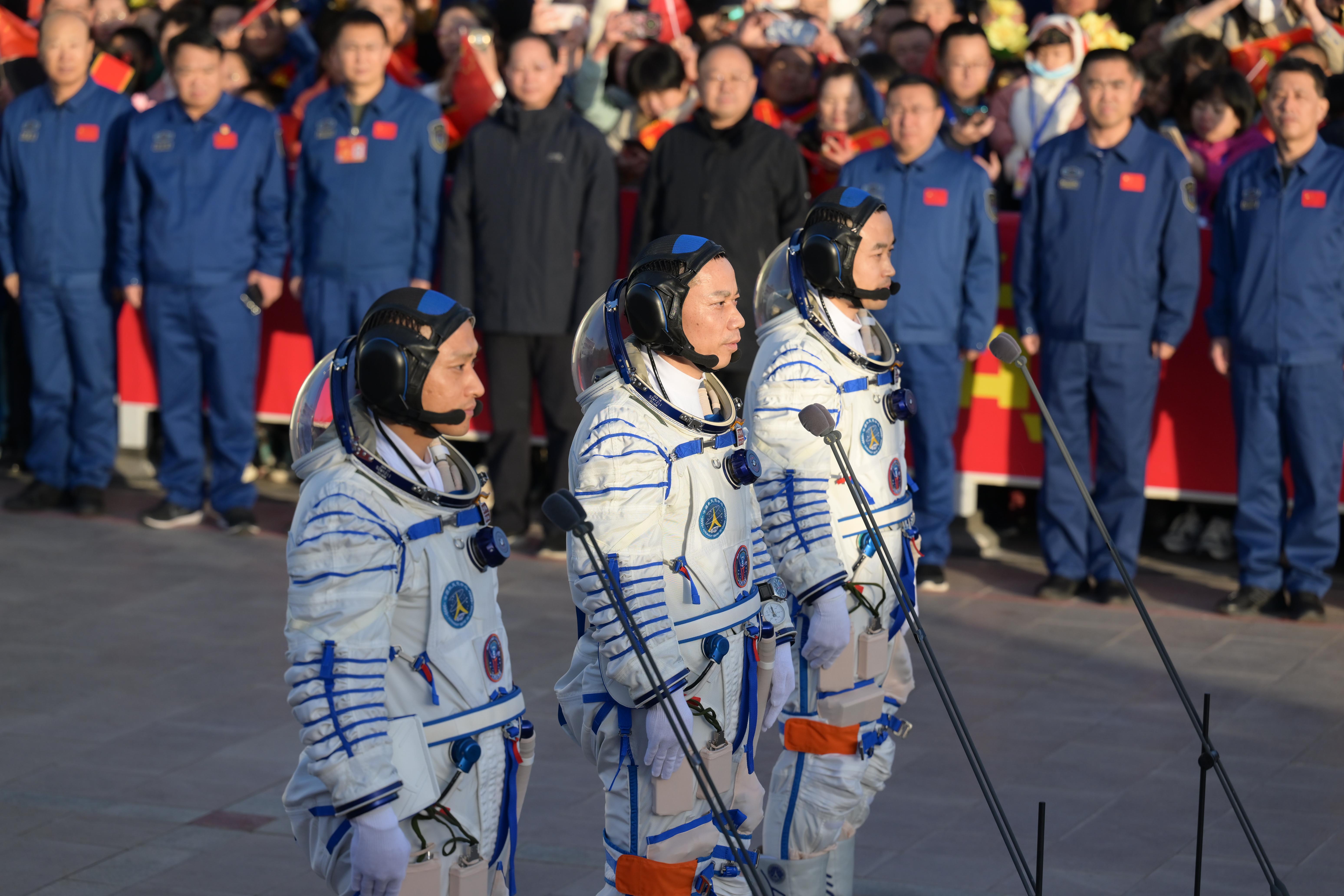10月26日上午,神舟十七号载人飞行任务航天员乘组出征仪式在酒泉卫星发射中心问天阁圆梦园广场举行。这是航天员汤洪波(右)、唐胜杰(中)、江新林在出征仪式上。新华社记者 李刚 摄