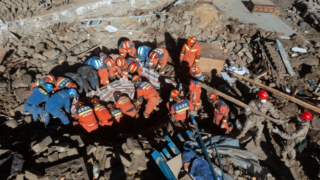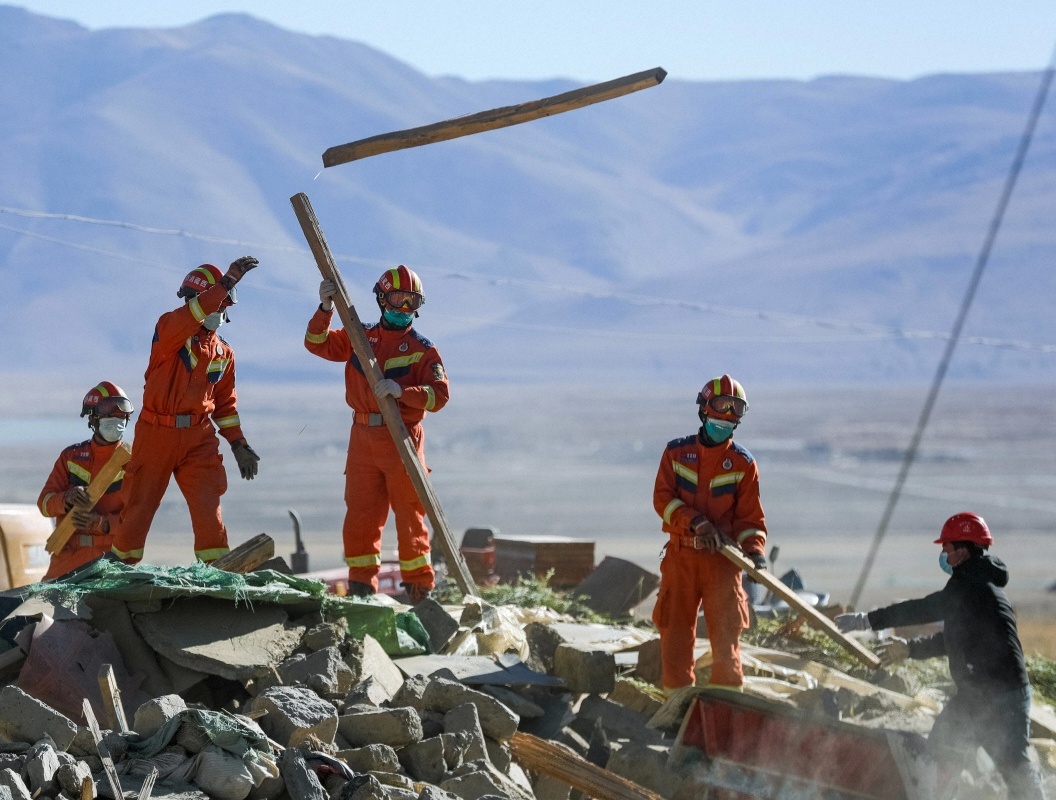 1月10日,救援人员在定日县长所乡古荣村清理震后废墟。
