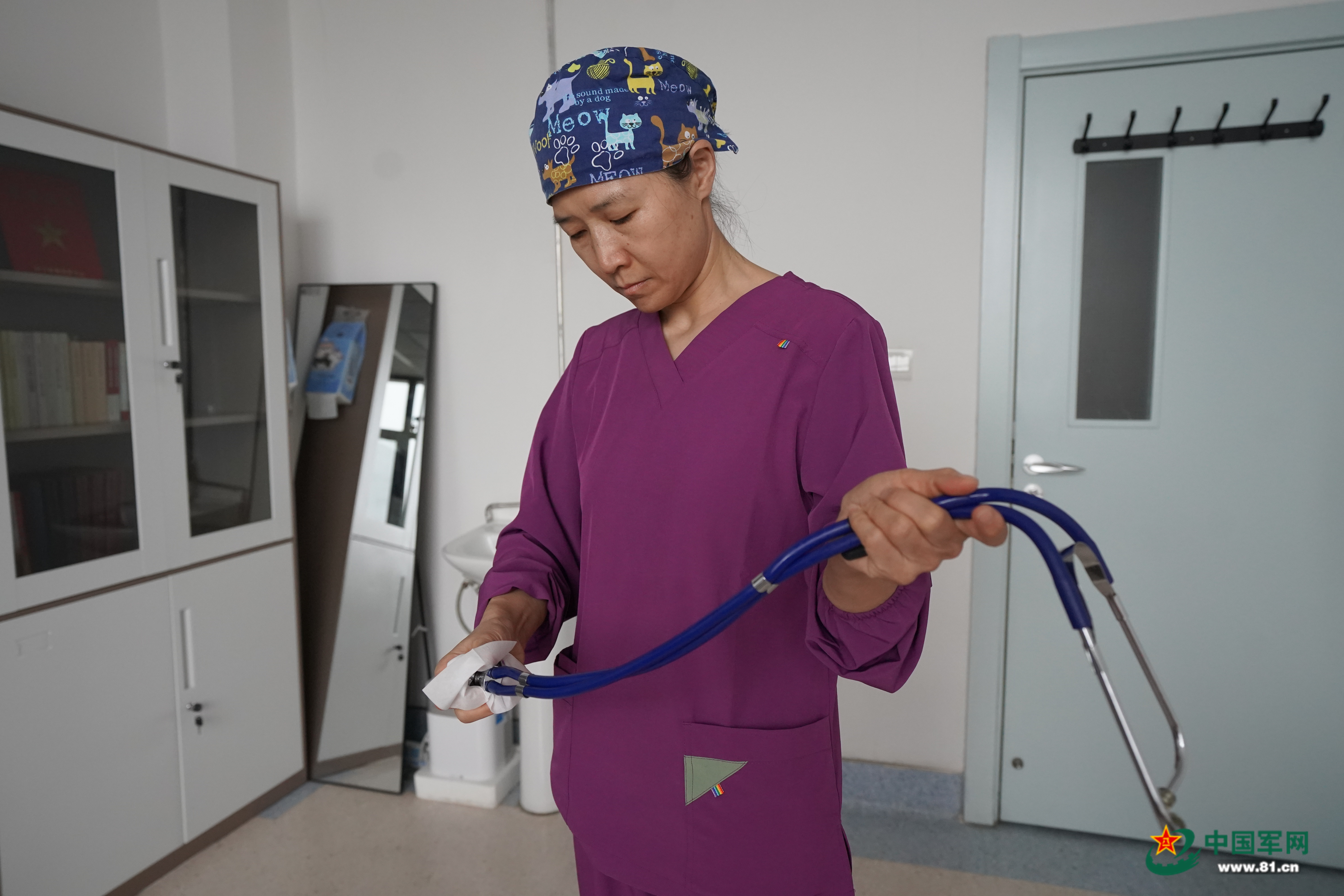 张瑛对听诊器进行酒精消毒。中国军网记者 林诗清 摄
