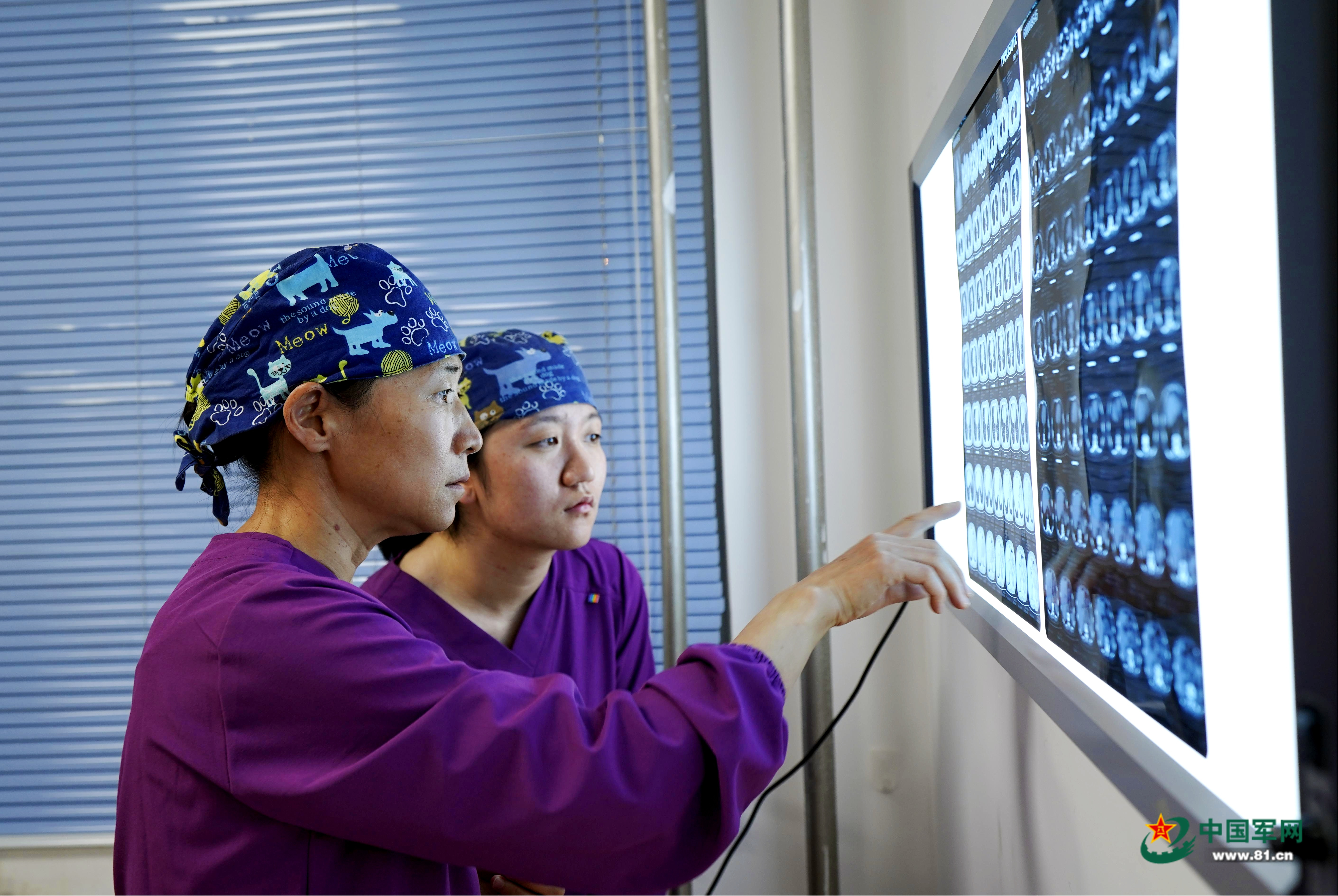 张瑛查看患者胸部CT片。中国军网记者 林诗清 摄