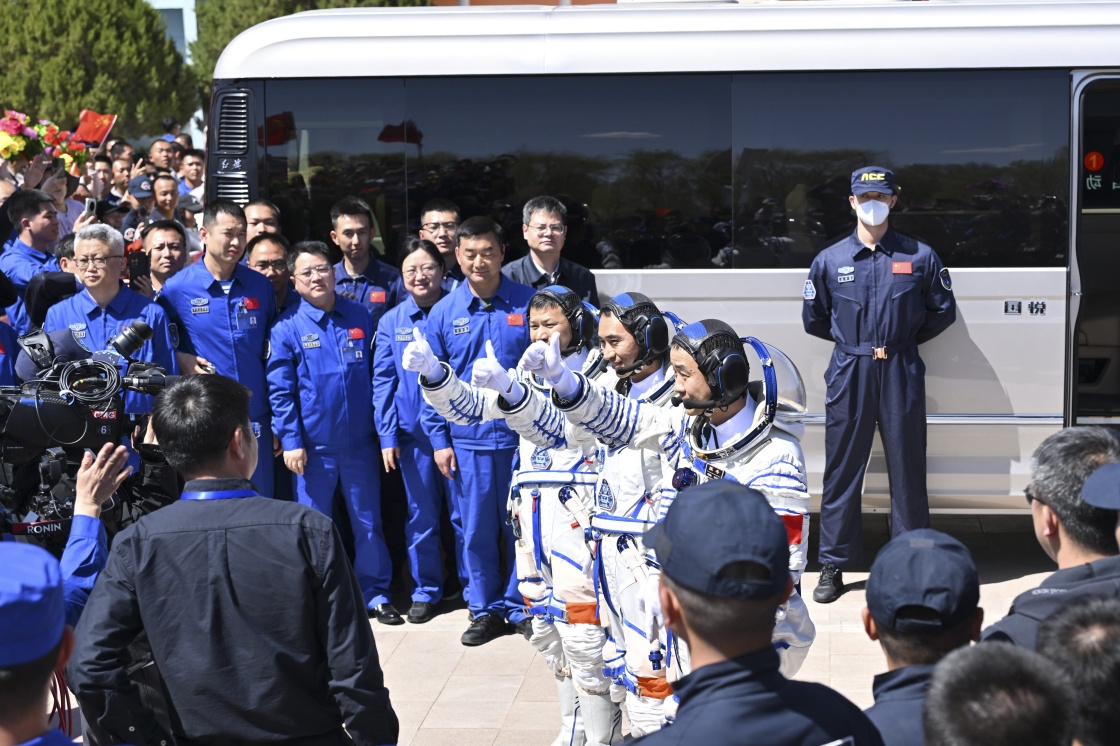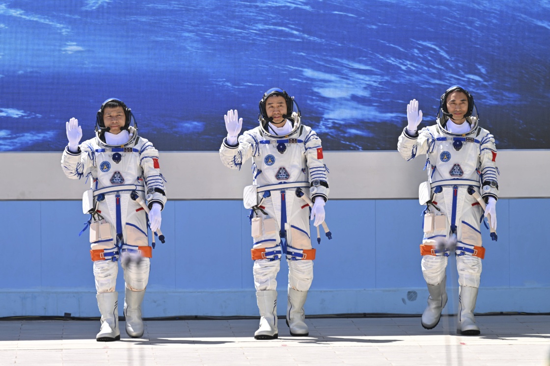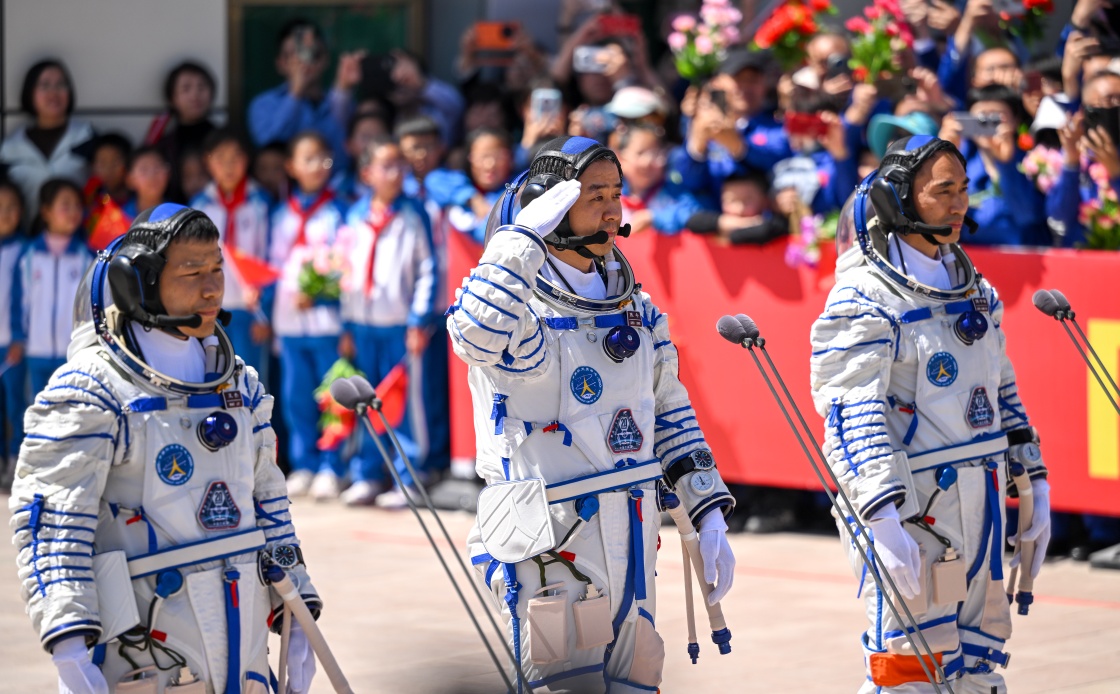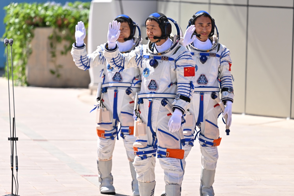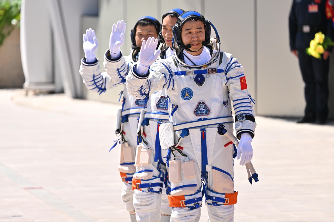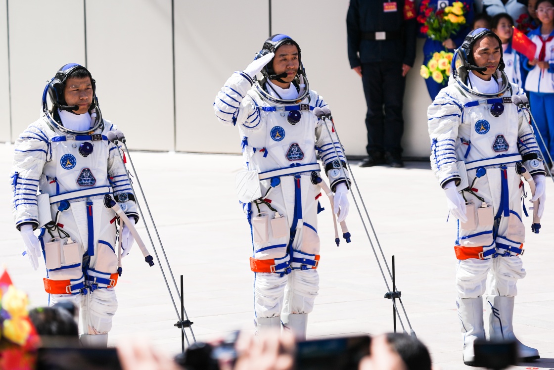 4月24日,神舟二十号载人飞行任务航天员乘组出征仪式在酒泉卫星发射中心问天阁圆梦园广场举行。这是航天员陈冬(右)、陈中瑞(中)、王杰在出征仪式上。新华社记者 连振 摄