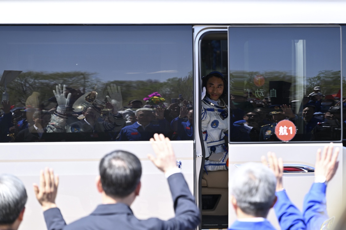 4月24日,神舟二十号载人飞行任务航天员乘组出征仪式在酒泉卫星发射中心问天阁圆梦园广场举行。这是航天员陈冬、陈中瑞、王杰在出征仪式上乘车出发。新华社记者 李鑫 摄