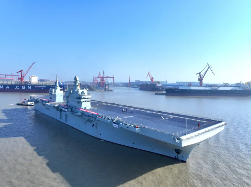 11月14日9时许,我国076两栖攻击舰首舰四川舰从上海沪东中华造船厂码头解缆启航,赴相关海域开展首次航行试验任务。