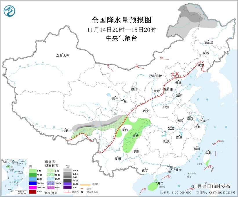 11月14日20时至15日20时,内蒙古东北部、黑龙江西北部、西藏东部、川西高原北部等地部分地区有小雪或雨夹雪,其中,内蒙古东北部、黑龙江西北部、西藏东北部、川西高原北部等地部分地区有中到大雪。陕西南部、四川盆地中东部、重庆大部、贵州西北部、云南东北部、海南岛等地部分地区有小雨。