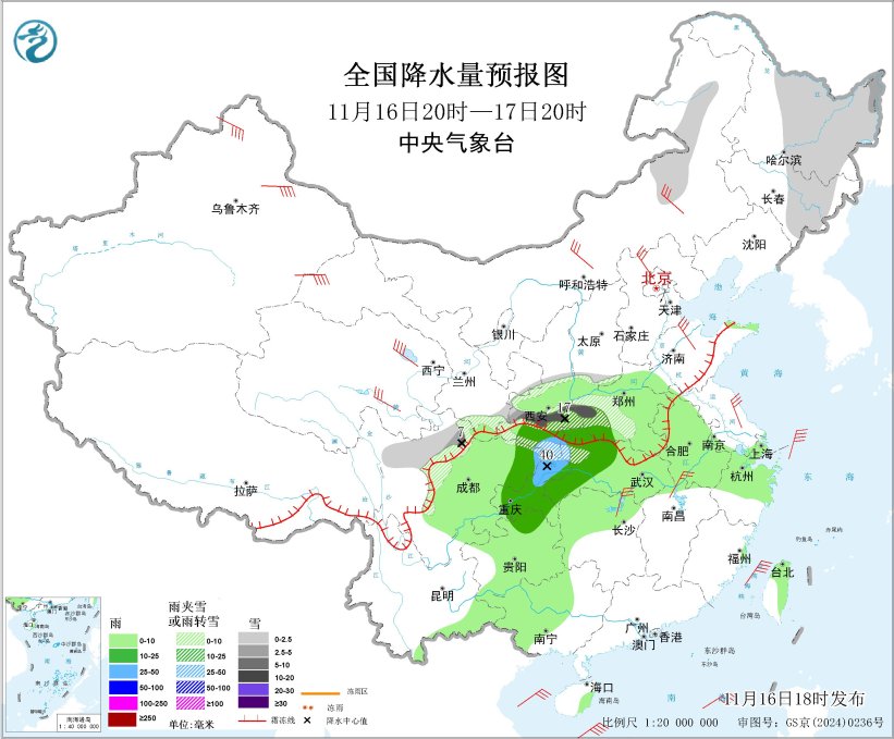 11月16日20时至17日20时,内蒙古东北部、东北地区东北部、川西高原北部、甘肃南部、陕西中南部、河南西部、湖北西部、重庆北部等地部分地区有小到中雪或雨夹雪,其中,陕西南部、河南西部、湖北西北部、重庆北部等地部分地区有大到暴雪(10~17毫米),新增积雪深度5~10厘米,局地可超过15厘米;黄淮西部、江淮大部、江汉、江南北部、西南地区东部、广西西部、云南东南部等地部分地区有小到中雨,其中,陕西东南部、重庆北部、湖北西部等地部分地区有大雨(25~40毫米)。
