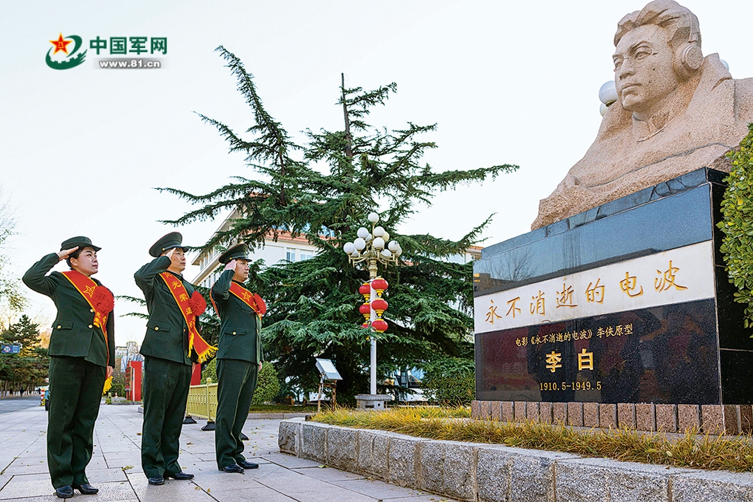 信息支援部队某部老兵离队前向革命先辈雕像敬军礼。