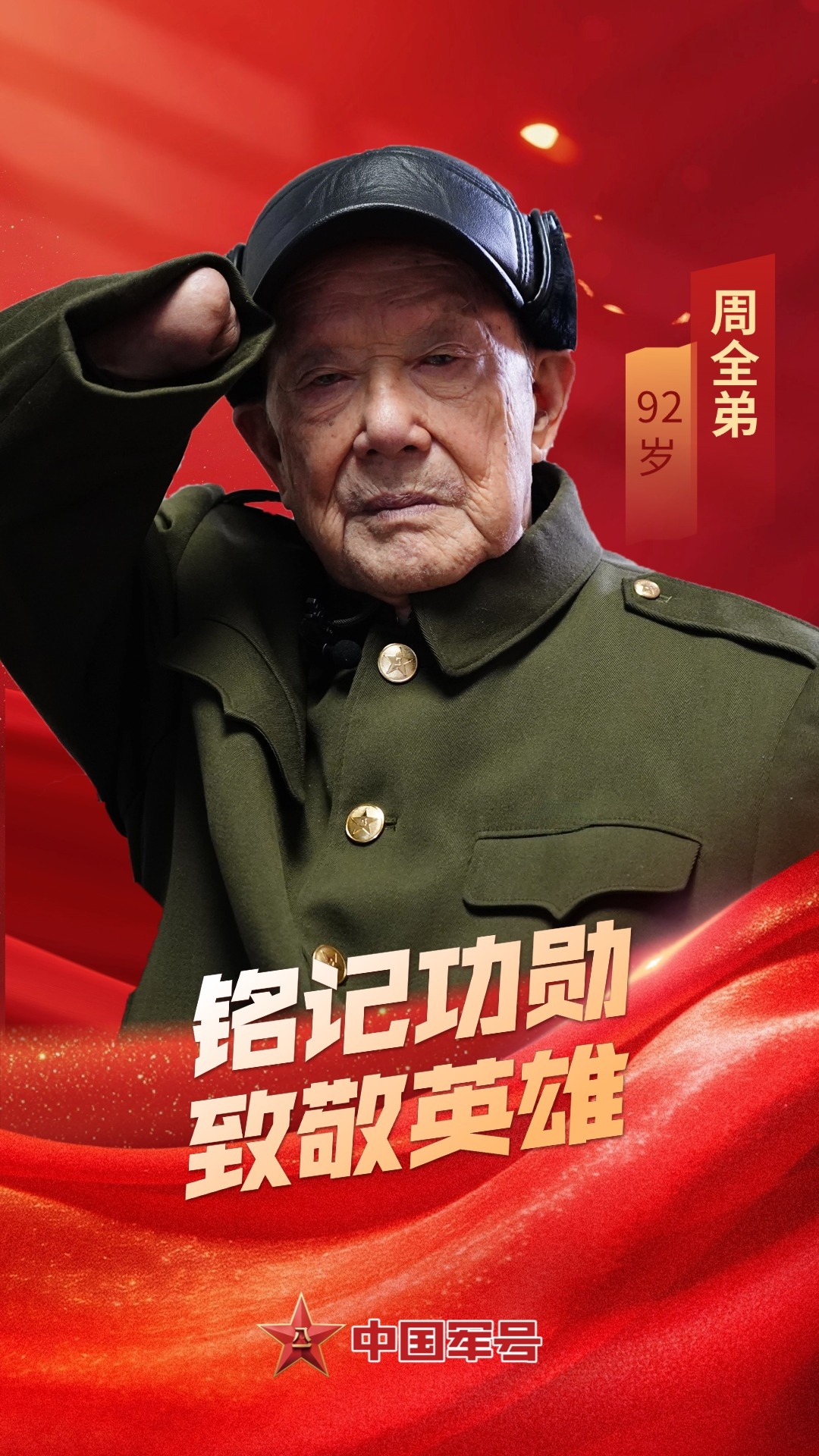 周全弟,四川省南部县人,1934年6月出生。原26军77师231团1营2连9班战士。1950年10月,年仅16岁的他随部队夜渡鸭绿江参加抗美援朝战争,参加了其中最惨烈的战役之一——长津湖战役。在对抗美军陆战一师的阻击战中,他身穿单薄棉衣,在零下40℃的雪地里埋伏三天三夜,严重冻伤致四肢截肢。多年来,周全弟始终心系老部队,2020年,经过军地多方协调,周全弟老部队——海军某部终于与他建立联系,并组织官兵上门看望。2024年7月,他被表彰为“全国模范退役军人”。2026年1月,入选2025年第四次“中国好人榜”助人为乐好人名单。