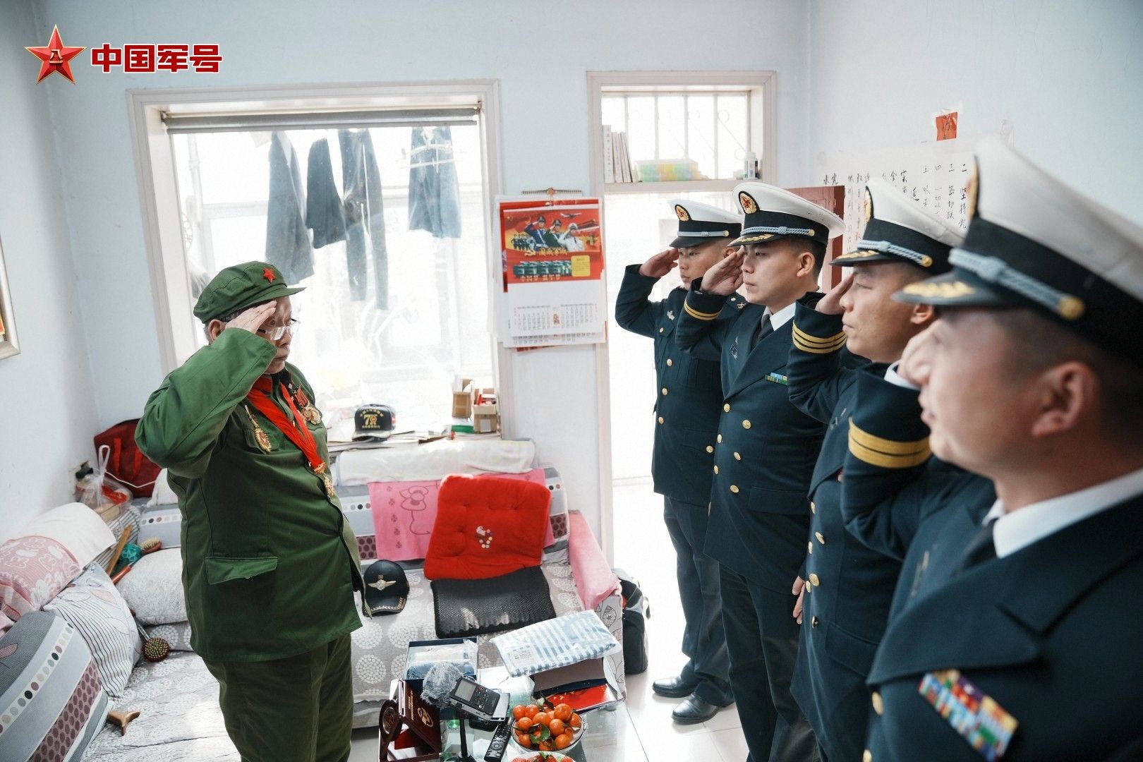 说话间,位于营区的官兵打来了视频电话,视频里的官兵整齐列队、精神昂扬,齐声向朱志学致以新春祝福。看着屏幕中朝气蓬勃的年轻战友,看着熟悉的荣誉旗帜,老人眼眶微微湿润,他挺直腰板,敬了个标准的军礼,并和连队官兵约定:“我知道,今年是咱们‘冲山阻击营’授称80周年,身体允许的话,我想回到咱们老部队看看。”他用略显颤抖的声音嘱托道:“你们要牢记,听党指挥,熟练手中武器,提高军事技能,守护好咱们的家国安宁……”
