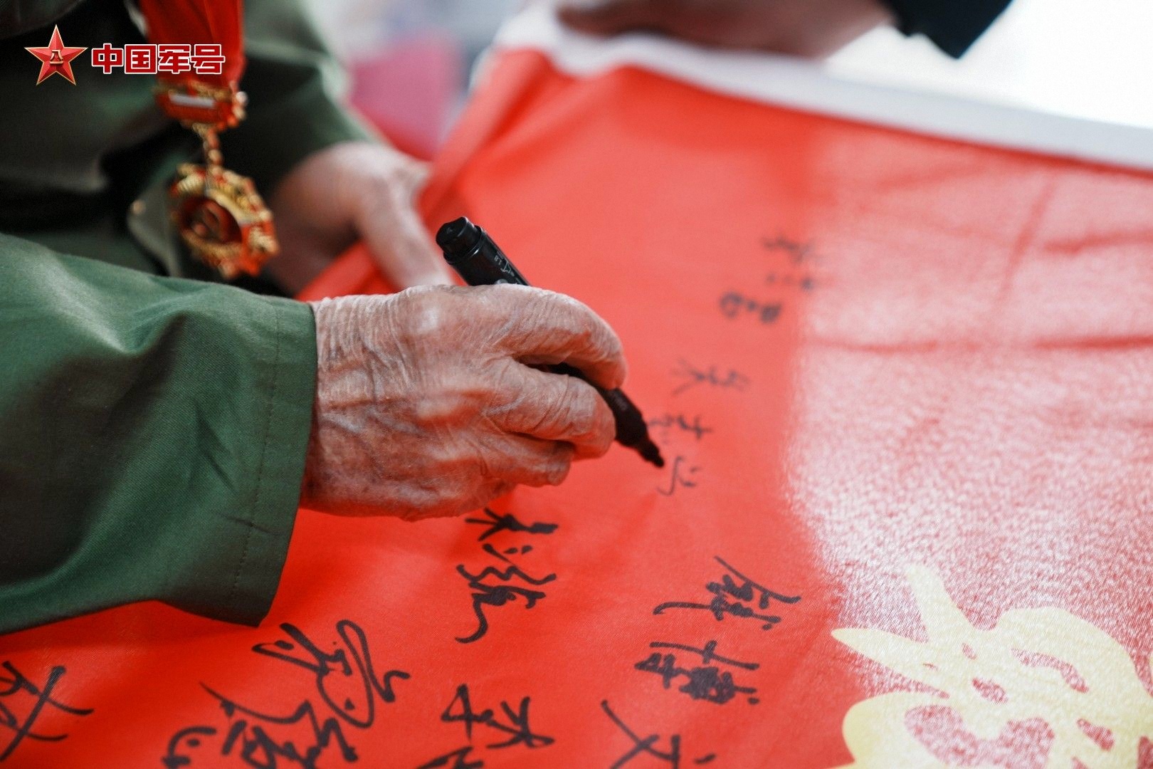 嘱托声声,字字千钧。视频那头的官兵齐声应答,声音铿锵,回荡在房间里,也回荡在每个人的心中。随后,官兵代表取出旗帜,郑重地递到朱志学手中。他接过旗帜,指尖轻轻摩挲着上面的字迹,神情庄重,拿起笔写下自己的名字,一笔一划饱含着对老连队的深情眷恋,也承载着对年轻一代的殷切期望。