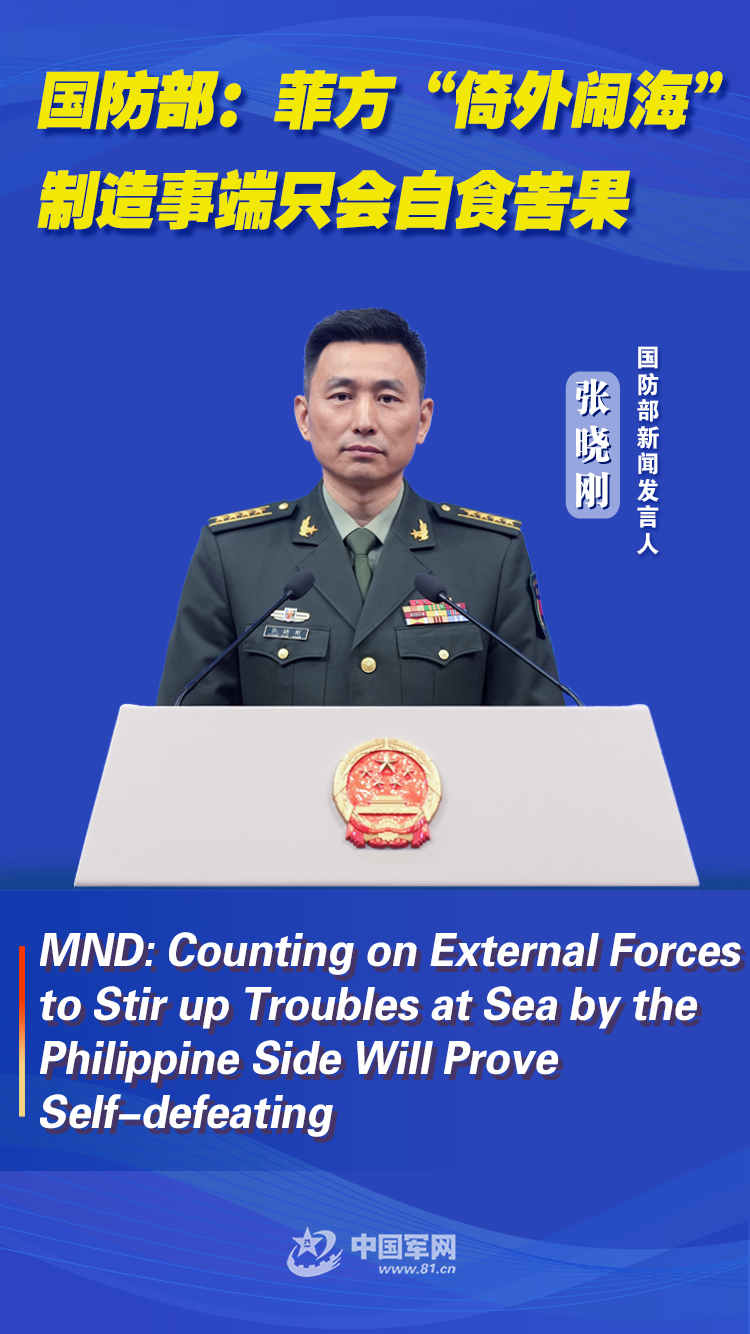 张晓刚:近来,菲方侵闯中国黄岩岛、南沙岛礁海空域,蓄意冲闯中方演训区,甚至危险接近中方舰艇,一再对中方侵权滋扰,在亚太地区制造不安全、不稳定风险。我们敦促菲方停止“倚外闹海”、制造事端,否则只会自食苦果、得不偿失。中方维护自身领土主权和海洋权益的决心坚定不移,将继续坚决回击任何侵权挑衅行径。