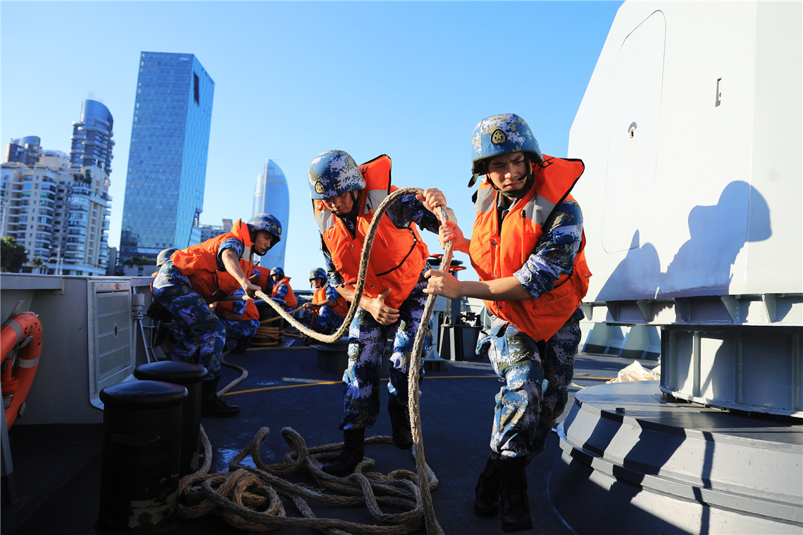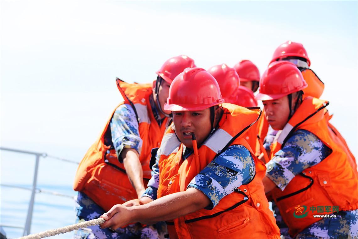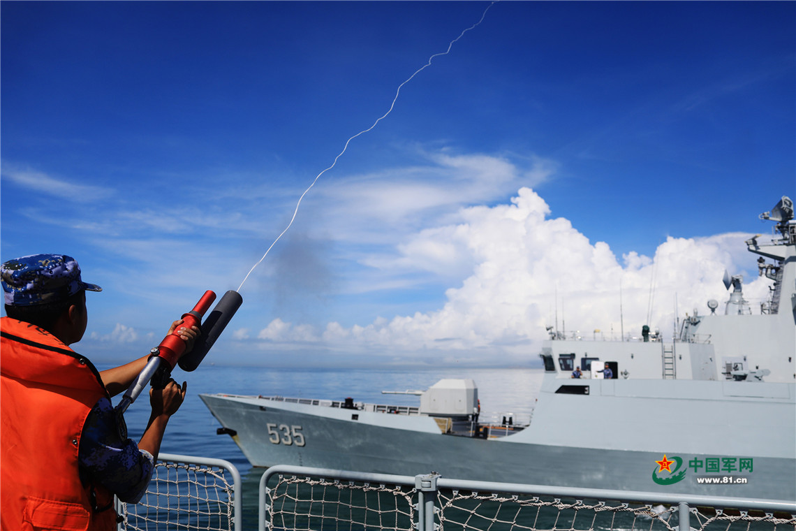 7月23日,编队组织海上拖带训练,这是铜仁舰帆缆兵利用撇缆枪发射缆绳。