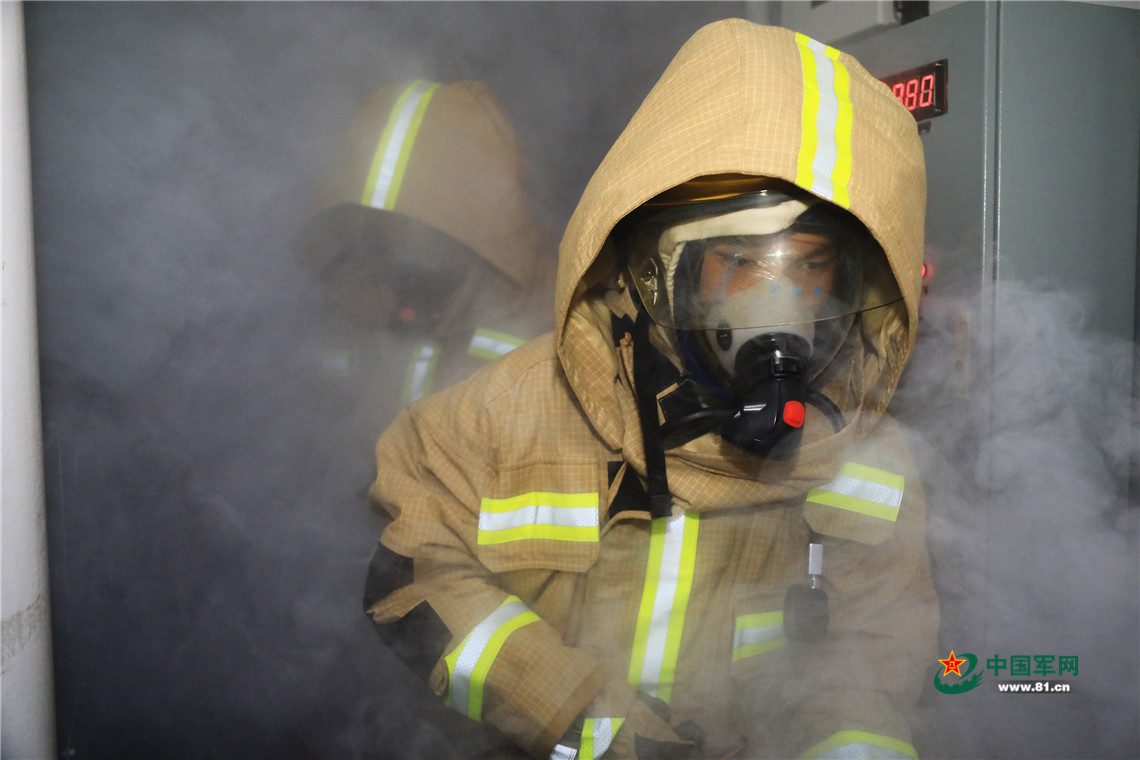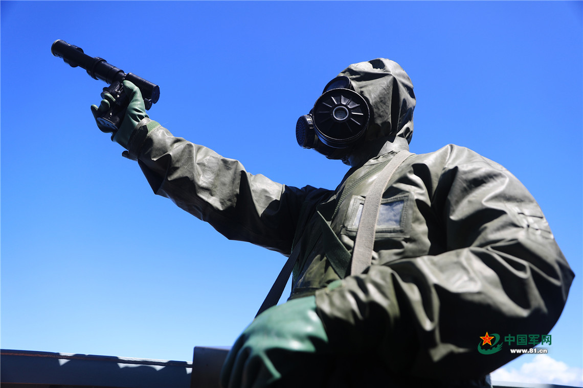 7月22日,铜仁舰组织海上防化操演,防化兵在进行侦毒。