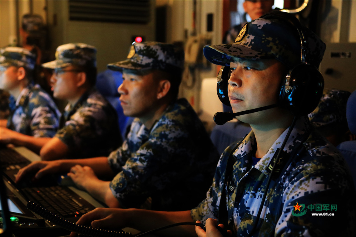 7月23日,编队开展综合防御操演,官兵在战位严阵以待。