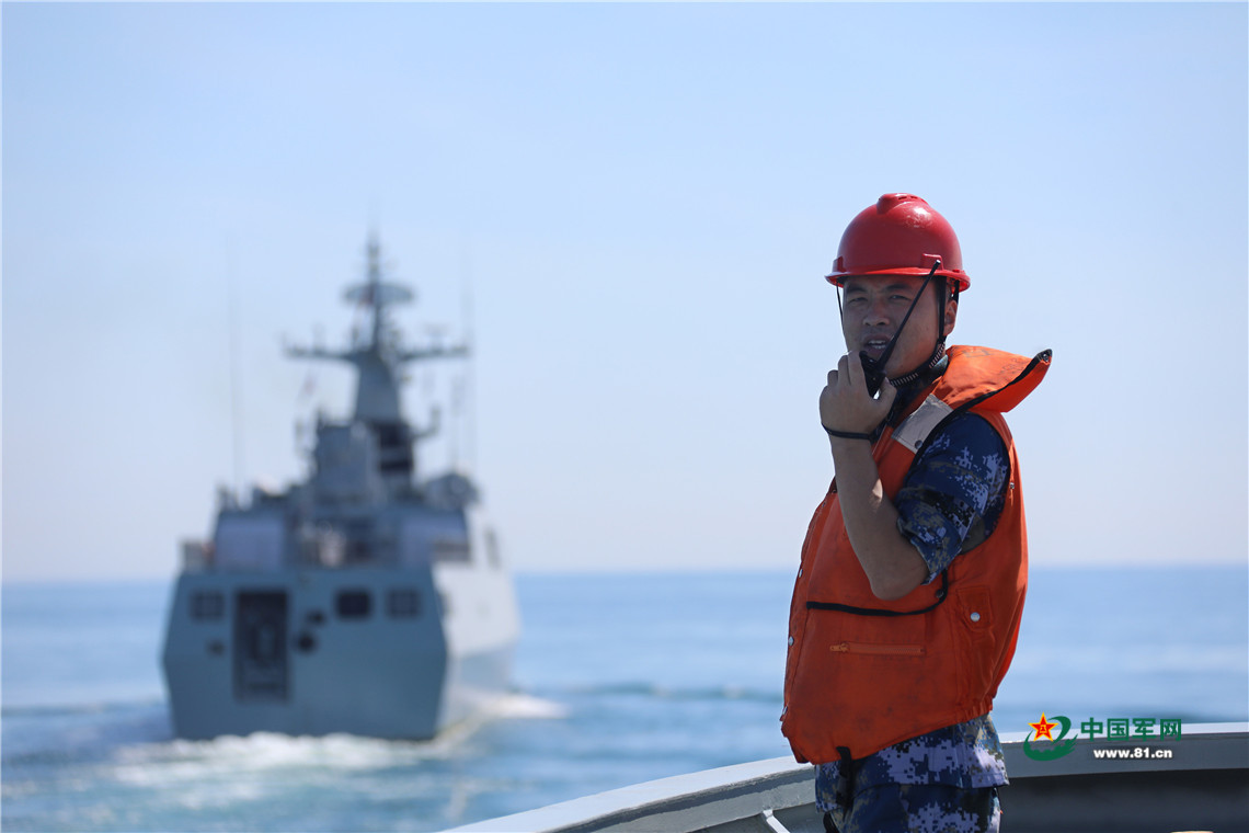 7月24日,编队开展海上补给训练,这是一名战士在观测舰位。