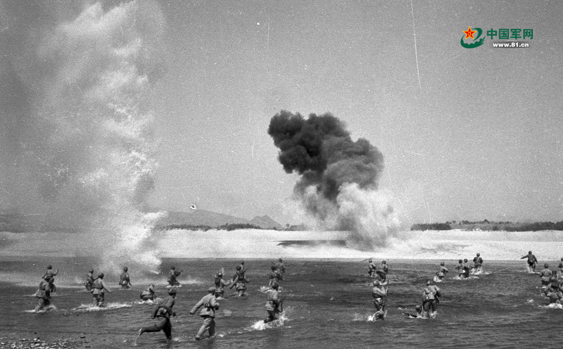 1951年1月,志愿军战士冒着炮火渡过汉江,追击敌人。