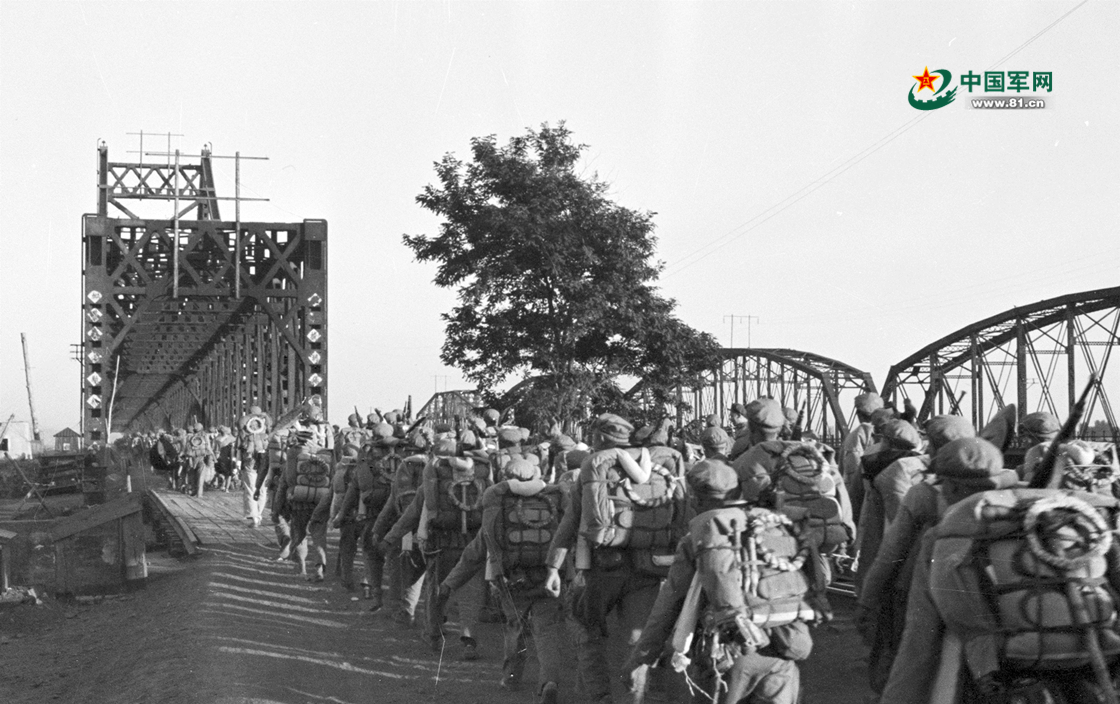 志愿军某部跨过鸭绿江大桥,奔赴朝鲜战场。