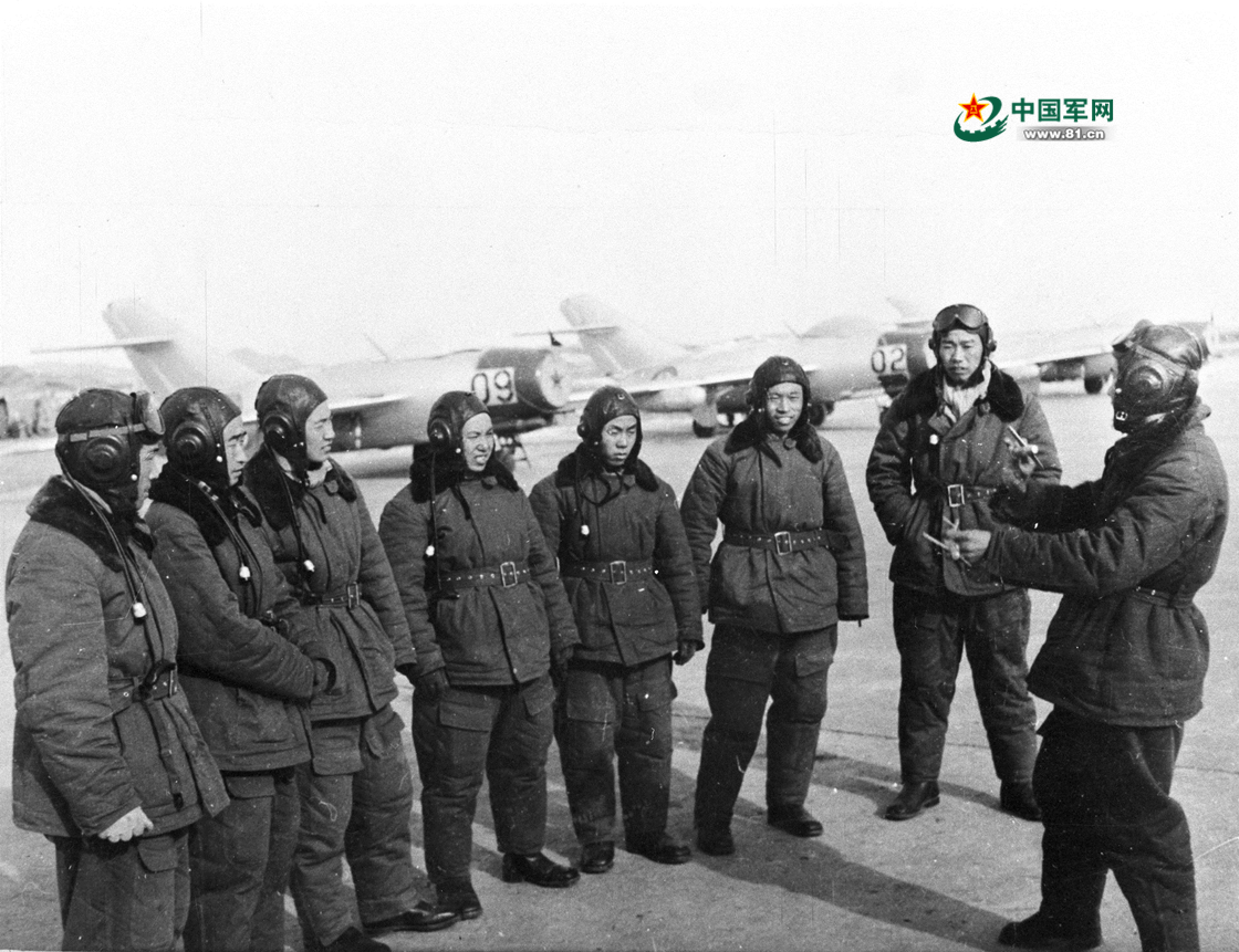 志愿军空军战斗英雄王海(右一)向飞行员讲解战术。