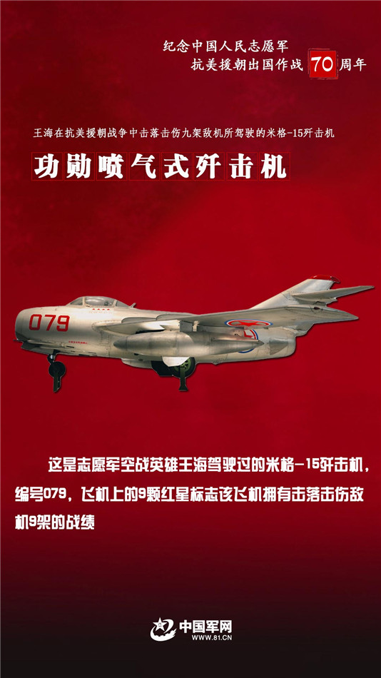 空战英雄王海驾驶米格-15歼击机,在抗美援朝战争中击落击伤9架敌机,编号079,飞机上的9颗红星标志该飞机拥有击落击伤敌机9架的战绩。
