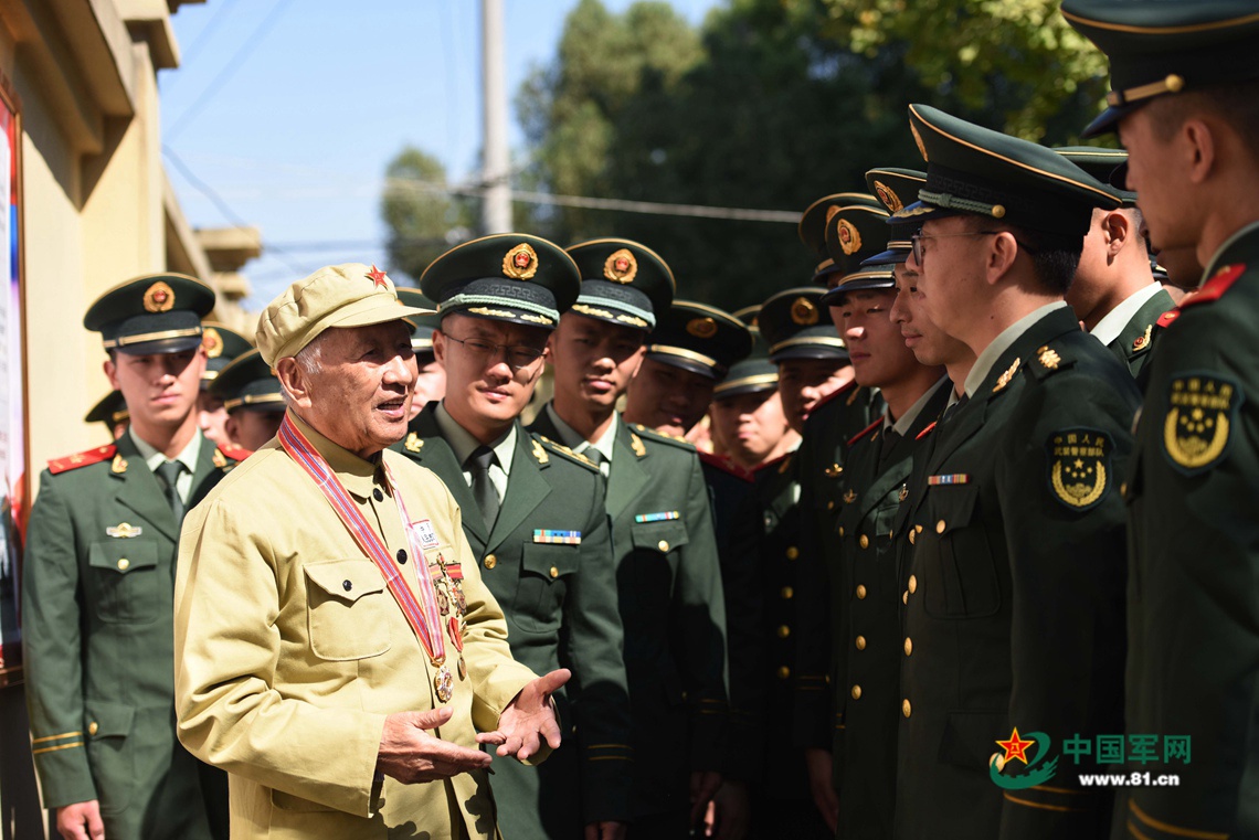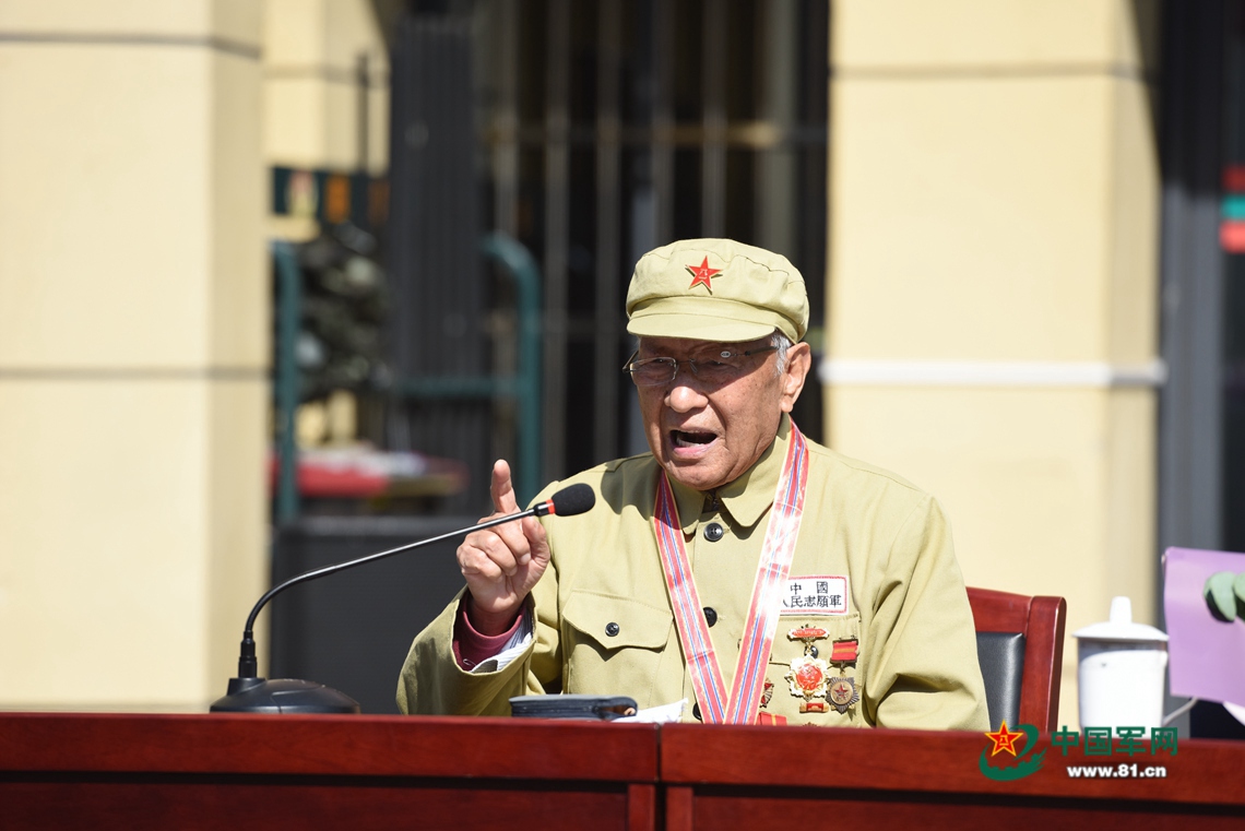 官兵们认真聆听抗美援朝老战士郑尊礼讲述当年入朝作战经历。