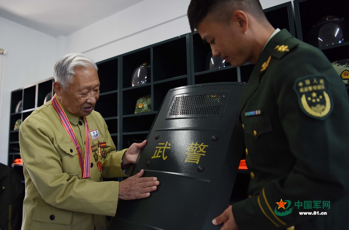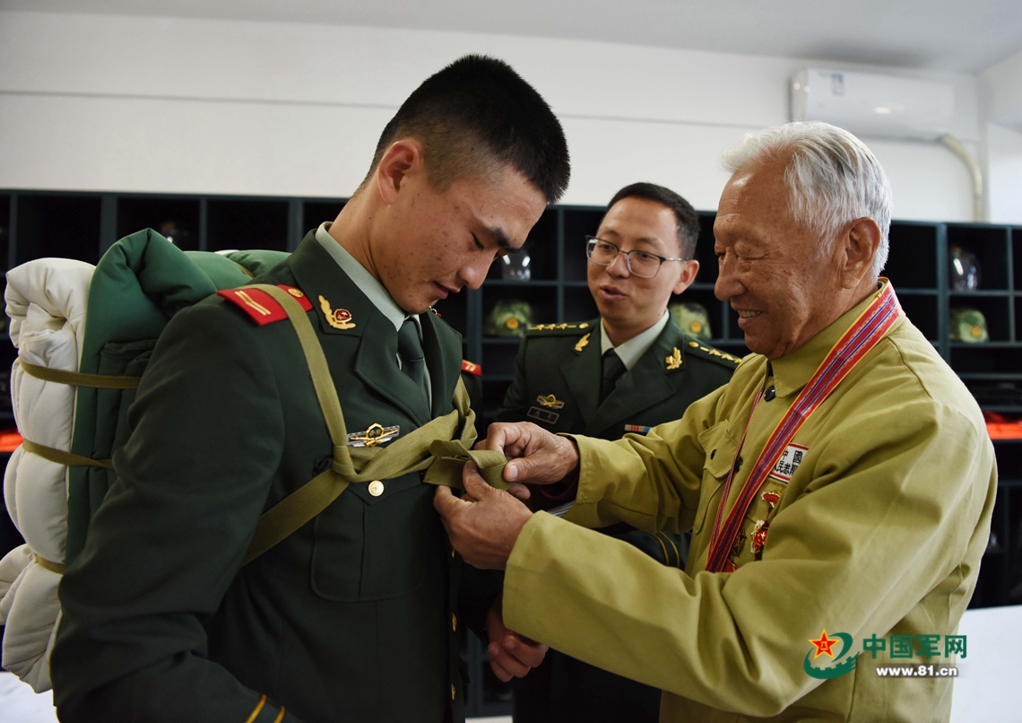 郑尊礼沿着军史长廊一路回忆峥嵘岁月,一路了解部队建设情况,当来到应急班宿舍,不禁惊叹竖起大拇指:“现在部队条件太好了!”看到叠放整齐的军被,郑老忍不住摸了摸被子,不禁想起了当年因为战火烧毁被褥而裹着雨布过夜的难忘经历。郑老还给战士们演示打背包,动作规范打得很标准,赢得大家的阵阵掌声。
