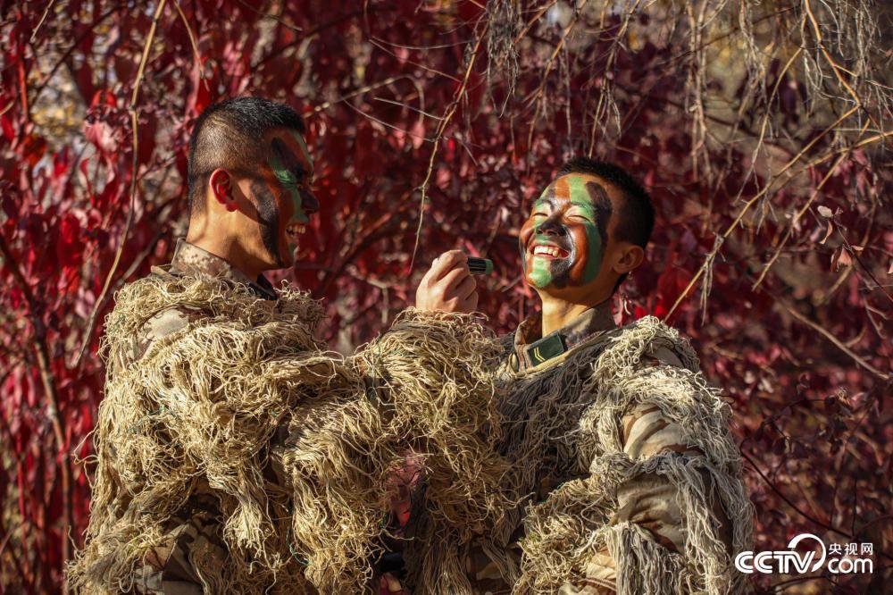图为相互涂抹迷彩油。(王磊、周家俊、张新年 摄影报道)