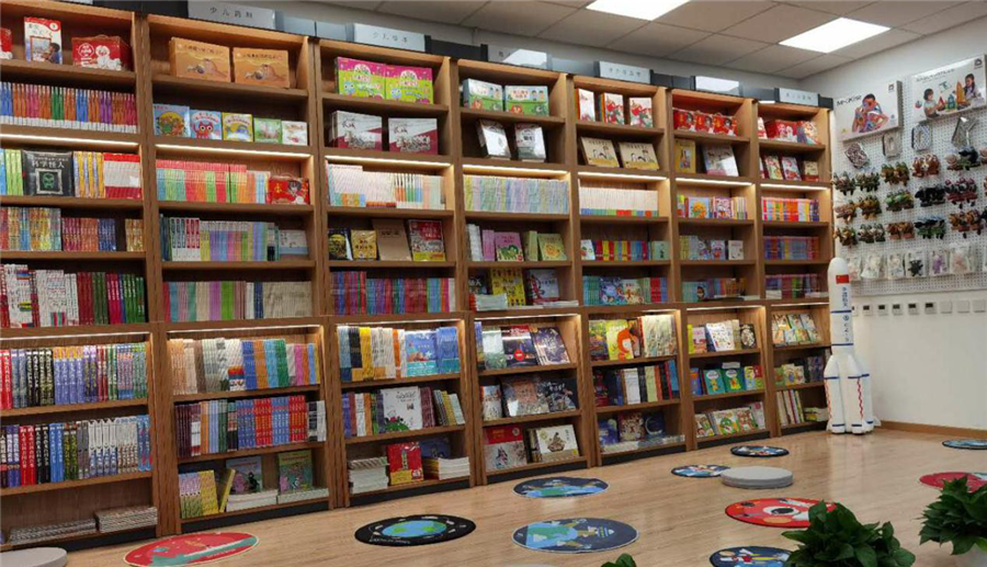 琳琅满目的幼儿图书陈列在书架上。