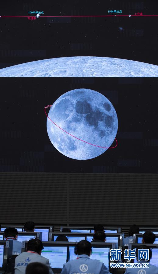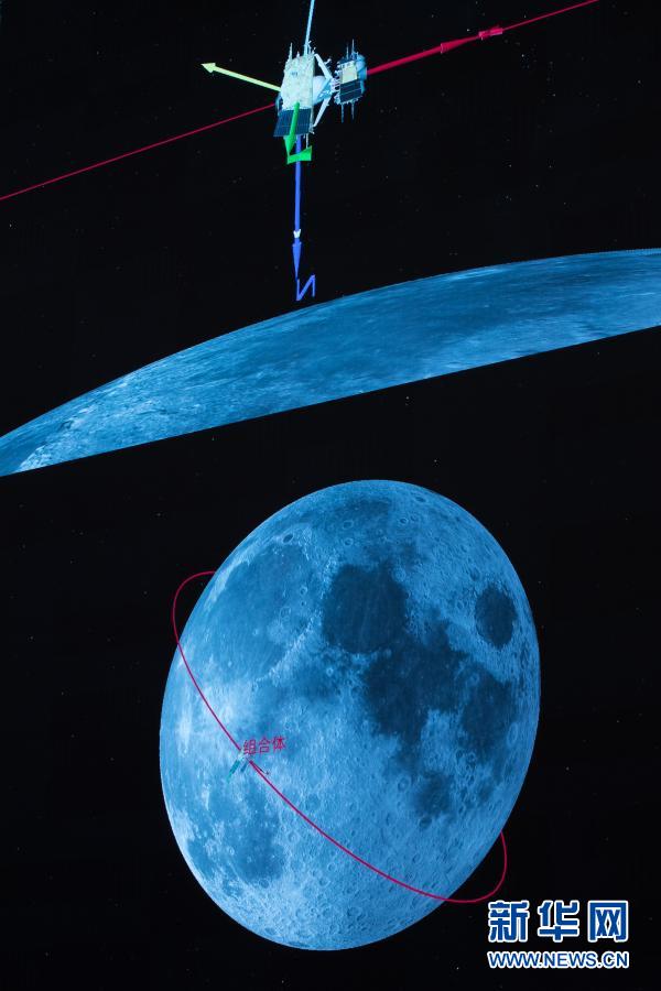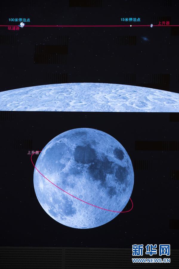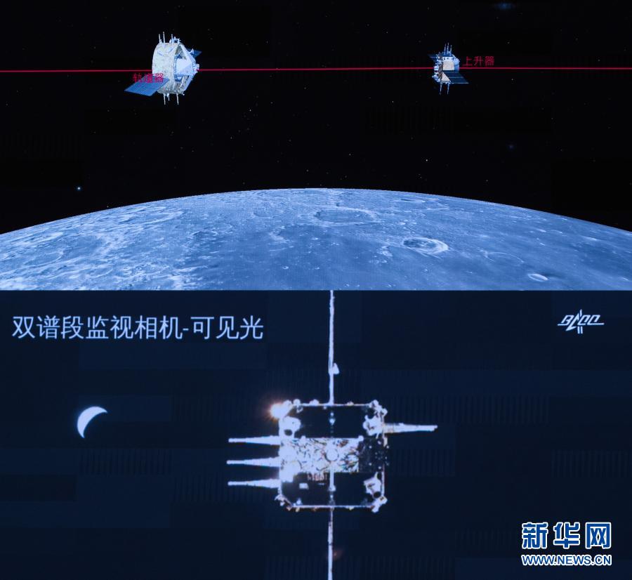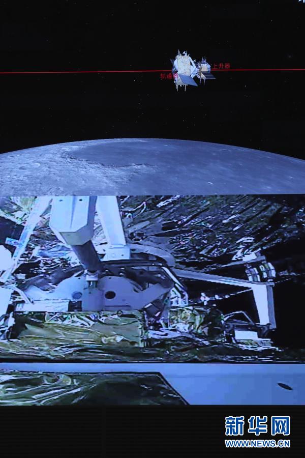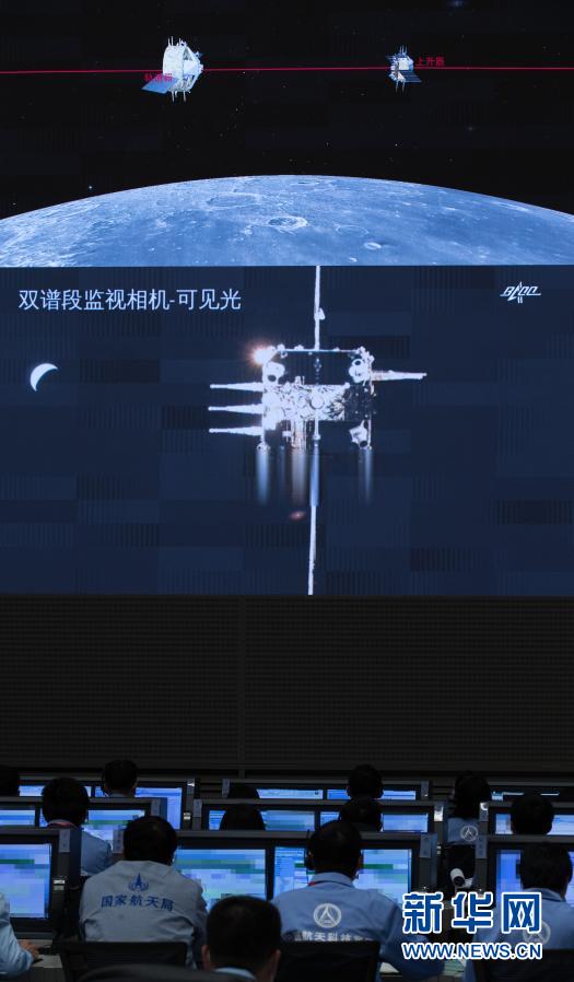 这是12月6日在北京航天飞行控制中心指挥大厅拍摄的嫦娥五号上升器与轨道器返回器组合体交会对接画面。新华社记者 金立旺 摄