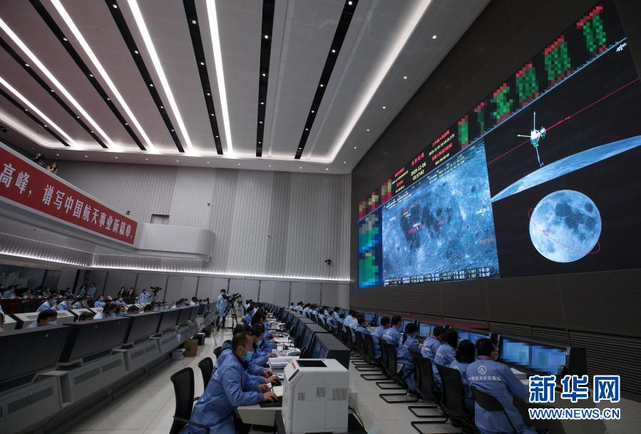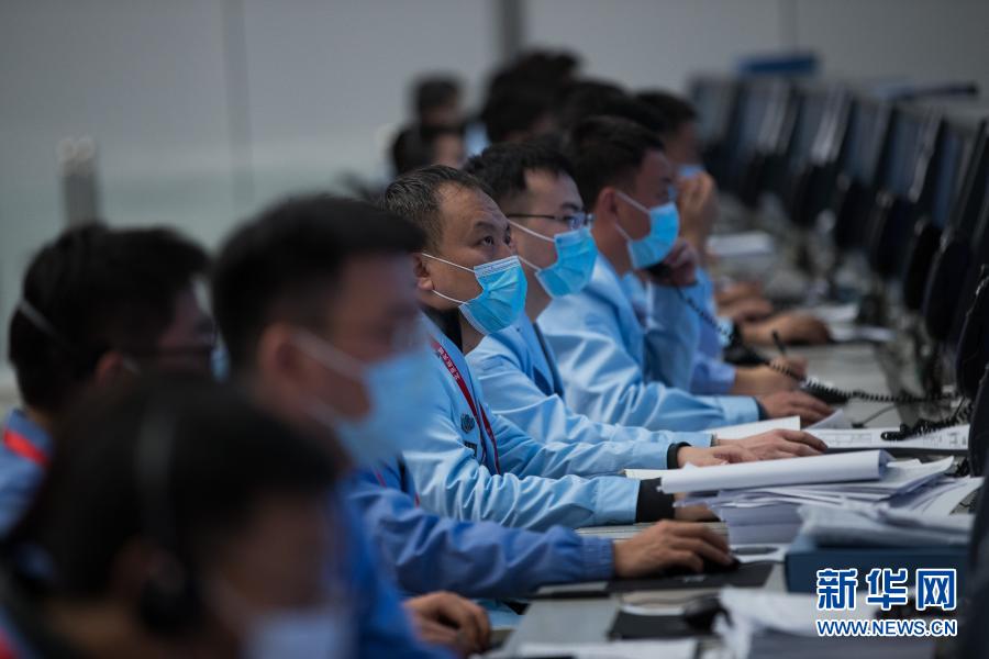 12月6日,航天科技人员在北京航天飞行控制中心指挥大厅监测嫦娥五号上升器在轨将月球样品容器转移至返回器情况。新华社记者 金立旺 摄