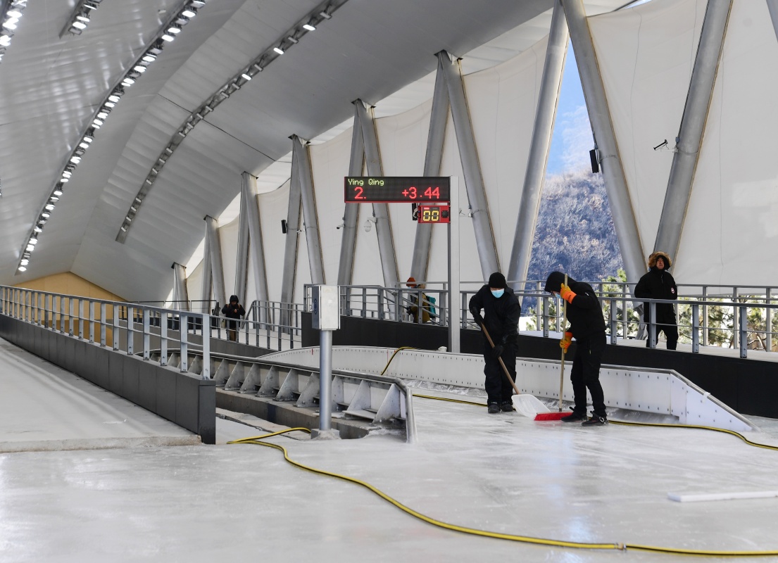 12月29日,工作人员在国家雪车雪橇中心清理冰面。新华社记者 张晨霖 摄