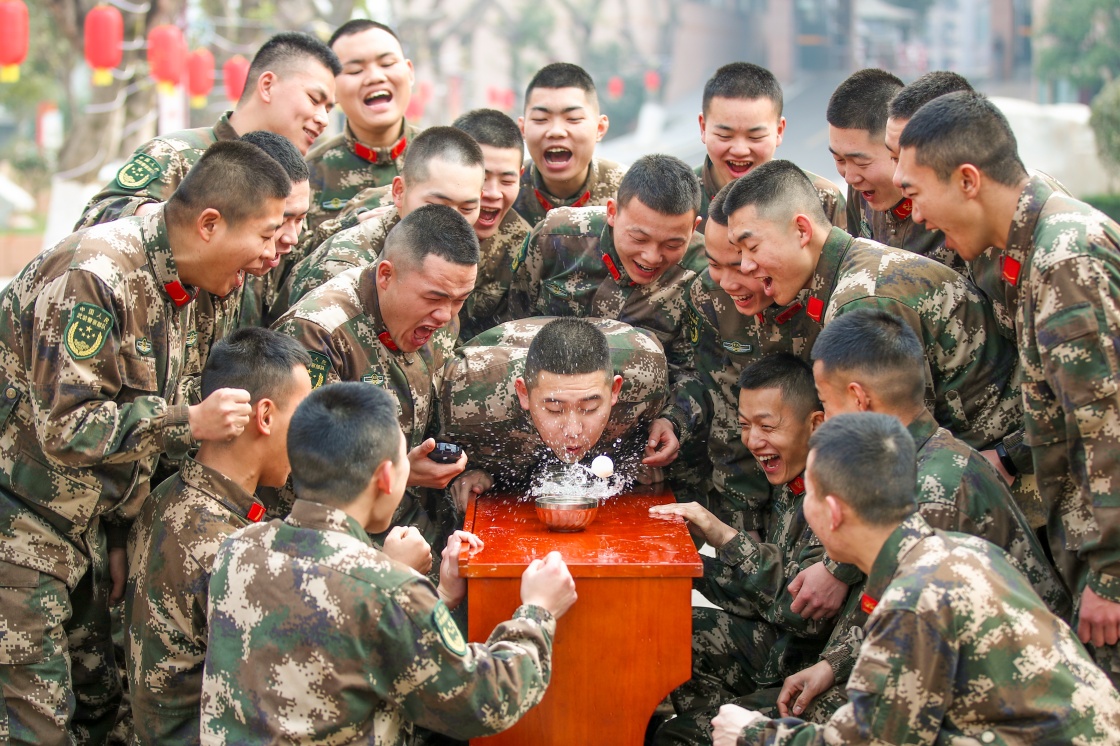 2月12日,武警海南总队某部官兵在游园活动中做游戏。新华社发(雷辙 摄)