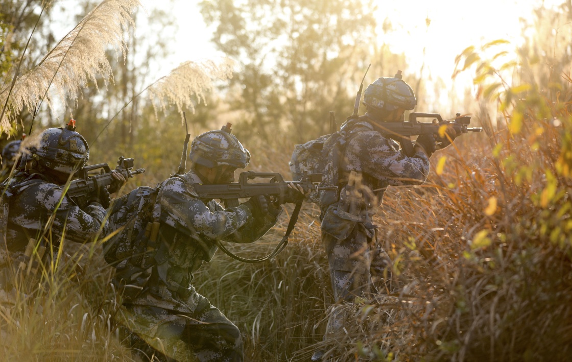 2月7日,海军陆战队某旅组织综合演练,陆战队员在芦苇丛中搜索藏匿的“敌人”。新华社发(贾成露 摄)